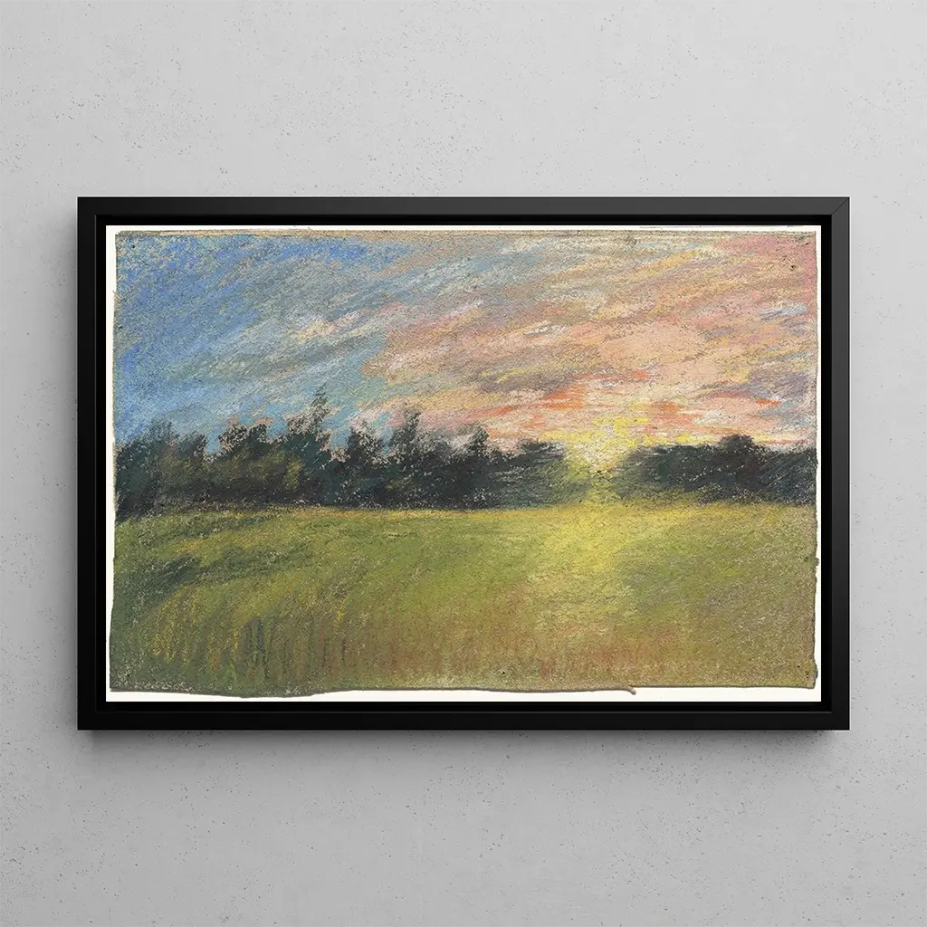 La toile "Un taidegrafiikka au coucher du soleil" de Paul Huet nous plonge dans un paysage bucolique où la douceur du crépuscule enveloppe la nature. Les couleurs chaudes, allant des oranges éclatants aux nuances dorées, créent une atmosphère sereine et apaisante. La technique de l'huile sur toile permet une subtile fusion des teintes, donnant vie aux herbes ondulantes et aux arbres majestueux. Ce tableau invite à la contemplation, transportant le spectateur dans un moment suspendu, où le temps semble s'arrêter face à la beauté éphémère d'un coucher de soleil.