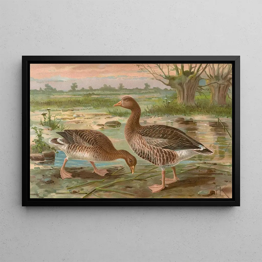 Anser anser : une ode à la nature sauvage La reproduction Anser anser de Johann Friedrich Naumann capture la beauté majestueuse de l'oie cendrée dans son habitat naturel. Avec des couleurs délicates et des détails minutieux, cette œuvre évoque une atmosphère paisible et contemplative. Les nuances de brun et de gris se mêlent harmonieusement, tandis que le fond flou met en valeur le sujet principal. La technique de l'aquarelle, utilisée avec finesse, permet de rendre la légèreté des plumes et la fluidité du mouvement. Cette représentation vivante invite le spectateur à plonger dans un monde où la nature règne en maître. Johann Friedrich Naumann : un pionnier de l'ornithologie artistique Johann Friedrich Naumann, actif au XIXe siècle, est reconnu pour son rôle essentiel dans l'illustration ornithologique. Influencé par le mouvement naturaliste, il a su allier art et science, offrant des représentations précises des oiseaux de son époque. Sa passion pour l'observation des oiseaux et son désir de les immortaliser sur toile ont fait de lui une figure incontournable dans le domaine de l'art animalier. Naumann a également contribué à la connaissance ornithologique à travers ses écrits, faisant de ses œuvres une référence pour les amateurs d'art et de nature. Une acquisition décorative aux multiples atouts La reproduction du tableau Anser anser constitue un choix décoratif idéal pour divers espaces tels que le salon, le bureau ou la chambre. Sa qualité d'impression et sa fidélité aux détails originaux en font une pièce d'art captivante qui attire le regard. En intégrant cette toile dans votre décoration intérieure, vous apportez une touche de nature et de sérénité à votre environnement. L'attrait esthétique de cette œuvre, allié à son histoire riche, en fait un ajout précieux à toute collection d'art ou à tout espace de vie.