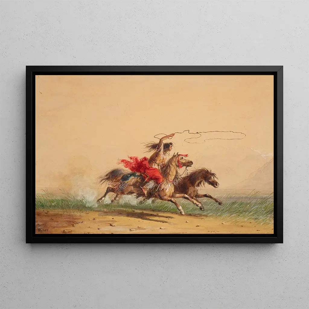 Dans cette œuvre captivante, Alfred Jacob Miller capture l'essence sauvage de l'Ouest américain à travers une scène dynamique où des cavaliers s'efforcent d'attraper des chevaux indomptés. Les couleurs terreuses et vibrantes évoquent la chaleur du soleil couchant, tandis que les détails minutieux des chevaux et des cavaliers témoignent d'une maîtrise technique remarquable. L'atmosphère est à la fois énergique et poétique, invitant le spectateur à ressentir l'adrénaline de cette poursuite audacieuse. Chaque coup de pinceau semble raconter une histoire, plongeant le regard dans un monde où la nature et l'homme s'affrontent avec passion.