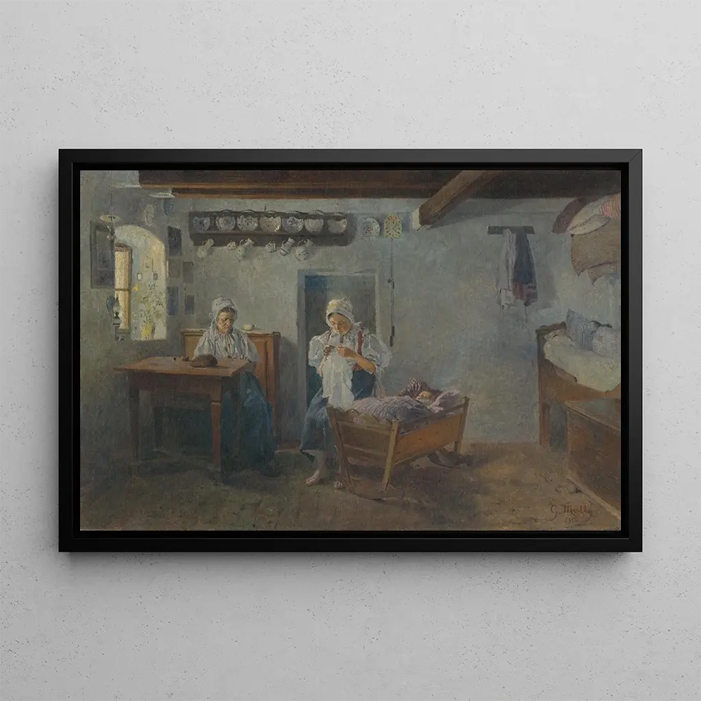 Au-dessus du Berceau, œuvre emblématique de Gustav Mahler, évoque une atmosphère empreinte de douceur et de sérénité. La composition, riche en nuances, joue sur des couleurs pastel qui se mêlent harmonieusement, créant une sensation de calme. La technique de l'artiste, qui allie peinture à l'huile et touches délicates, confère à cette toile une profondeur émotionnelle. Chaque coup de pinceau semble raconter une histoire, celle d'un moment suspendu dans le temps, où la tendresse maternelle se mêle à l'innocence de l'enfance. Cette œuvre invite à la contemplation, à l'évasion dans un monde où l'amour et la protection règnent en maîtres.