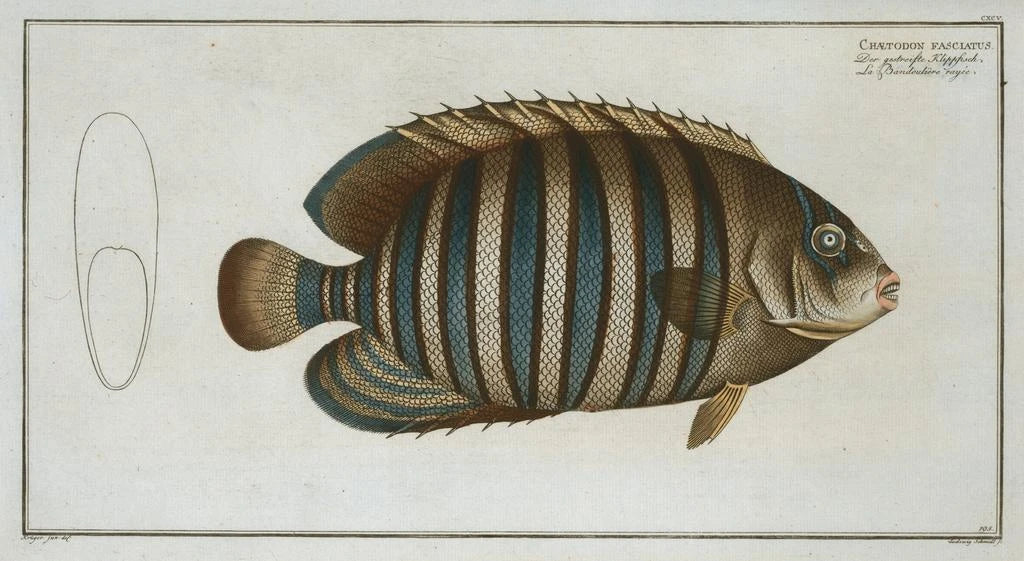 Marcus Elieser Bloch, naturaliste et artiste du XVIIIe siècle, est reconnu pour ses contributions à l'ichtyologie, l'étude des poissons. Son œuvre "Chaetodon fasciatus" fait partie d'une série de représentations de poissons qui allient rigueur scientifique et esthétique. Bloch a voyagé à travers l'Europe et l'Asie, s'inspirant de la diversité marine qu'il a rencontrée. Son approche novatrice a permis de sensibiliser le public à la beauté et à la fragilité des écosystèmes aquatiques, faisant de lui une figure emblématique de l'art naturaliste.