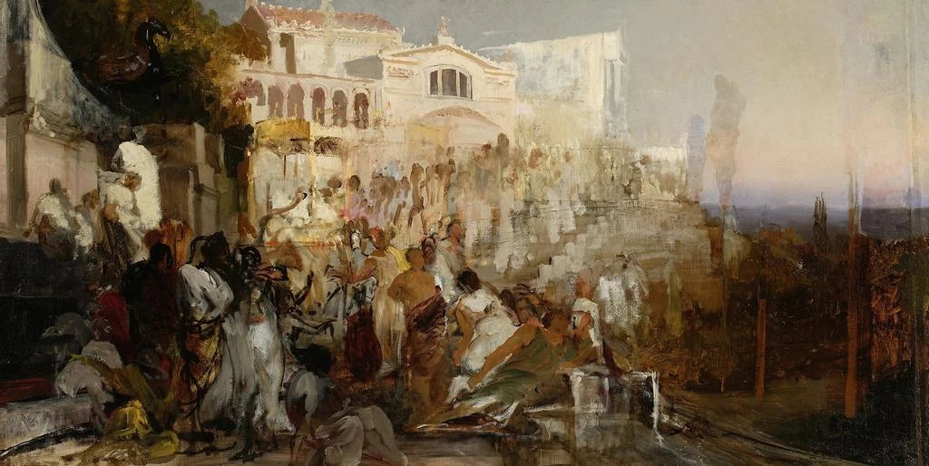 Dans cette esquisse captivante de Henryk Siemiradzki, les chandeliers s'élèvent majestueusement, illuminant un espace empreint de sérénité. Les couleurs chaudes et dorées se mêlent à des nuances de bleu et de vert, créant une atmosphère à la fois mystique et apaisante. La technique de Siemiradzki, mêlant réalisme et éléments symboliques, permet à l'œuvre de transcender le simple décor pour devenir une véritable invitation à la contemplation. Chaque détail, chaque ombre, semble raconter une histoire, une connexion entre le sacré et le profane, offrant au spectateur une expérience visuelle enrichissante.