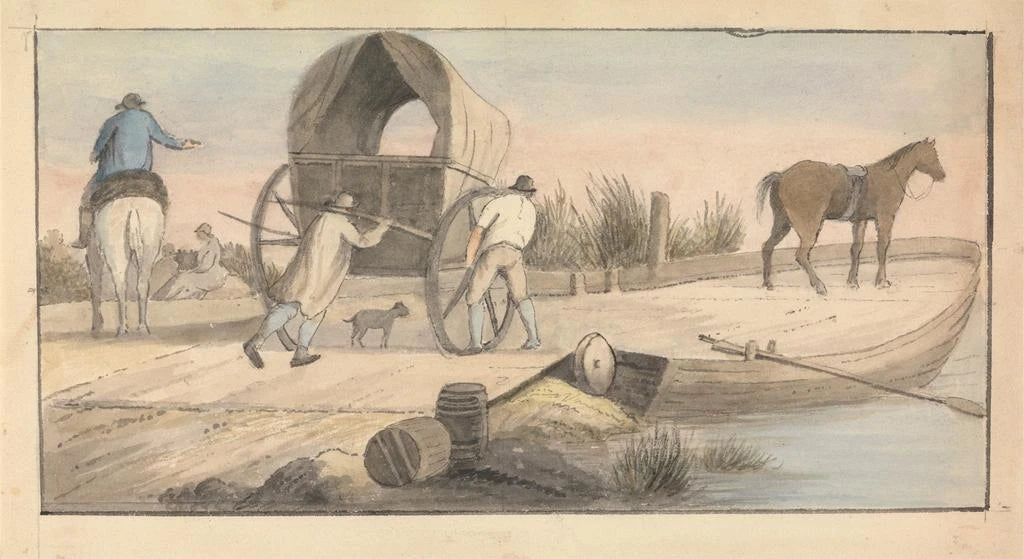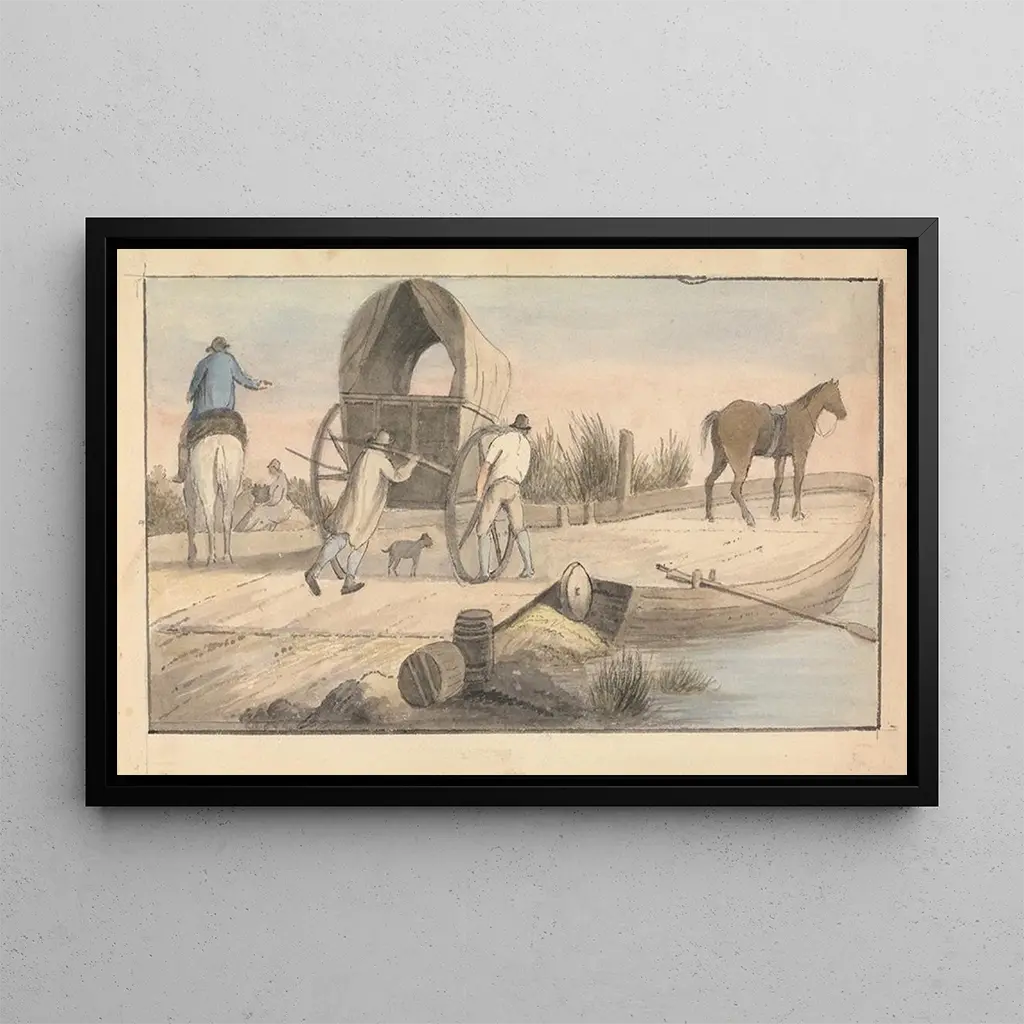 L'œuvre "Embarquement sur le ferry" d'Edward Francis Burney capture avec finesse un moment de transition et d'expectation. La composition est riche en détails, où chaque personnage semble porter une histoire. Les couleurs douces et pastel évoquent une atmosphère paisible, tandis que la technique de l'aquarelle confère une légèreté à la scène. Les reflets sur l'eau ajoutent une dimension dynamique, invitant le spectateur à ressentir le mouvement du ferry prêt à prendre le large. Ce tableau, à la fois narratif et contemplatif, transporte l'observateur dans une époque où le voyage était synonyme d'aventure.