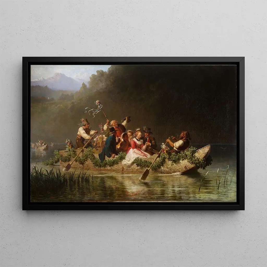 Dans cette œuvre captivante, Julius Köckert nous transporte au cœur d’un mariage traditionnel, flottant sur les eaux paisibles d’un lac de montagne. Les couleurs vives et les détails minutieux des costumes des mariés et des invités créent une atmosphère festive et joyeuse. La lumière douce qui se reflète sur l’eau ajoute une dimension presque magique à la scène, tandis que les majestueuses montagnes en arrière-plan évoquent la grandeur de la nature. La composition harmonieuse et l’équilibre des éléments témoignent d’un savoir-faire exceptionnel, invitant le spectateur à s’immerger dans ce moment de célébration.