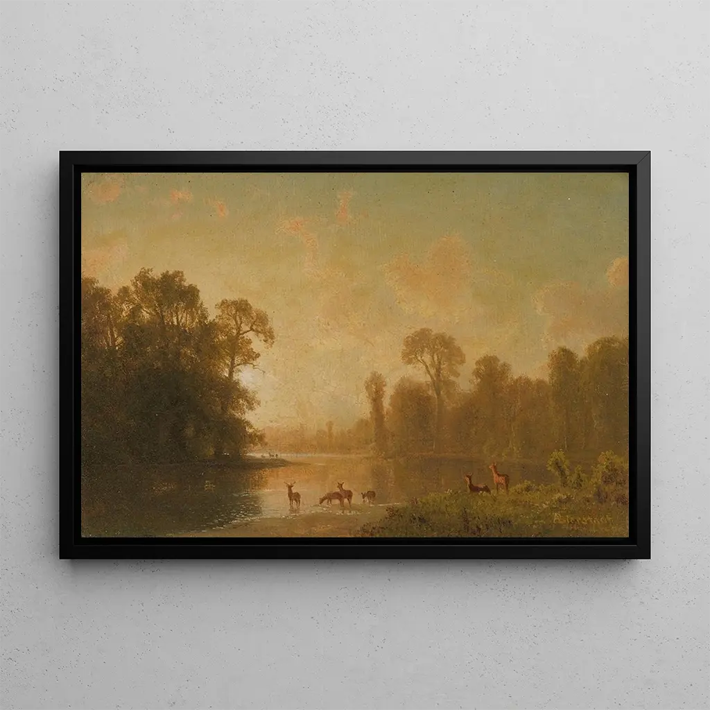 Dans cette œuvre captivante, Albert Bierstadt nous transporte au cœur d'un paysage majestueux, où le crépuscule enveloppe la scène d'une douce mélancolie. Les cerfs, silhouettes élégantes, se déplacent avec grâce à travers une forêt baignée de lumière dorée. Les couleurs chaudes et les nuances délicates du ciel se mêlent harmonieusement aux teintes plus sombres des arbres, créant une atmosphère à la fois sereine et mystérieuse. La technique de Bierstadt, caractérisée par un réalisme saisissant et une attention minutieuse aux détails, nous invite à contempler la beauté éphémère de la nature.