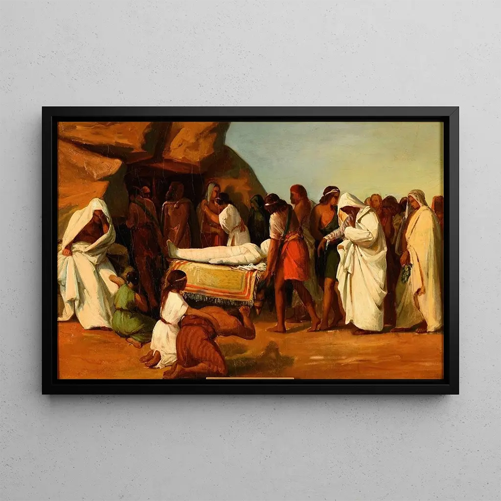 " de Dominique Louis Papety est une œuvre poignante qui capture le moment solennel du passage. La composition est soigneusement orchestrée, où chaque personnage, vêtu de noir, exprime une émotion profonde à travers des gestes et des regards chargés de sens. Les couleurs sombres dominent, créant une atmosphère de recueillement, tandis que des touches de lumière viennent souligner les visages empreints de tristesse. La technique de Papety, mêlant réalisme et romantisme, donne vie à cette scène, invitant le spectateur à réfléchir sur la fragilité de la vie et l'importance des rituels de deuil.