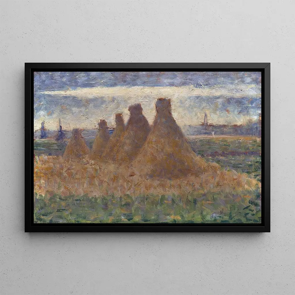 Meules de foin : een ode aan licht en natuur De "Meules de foin" van Georges Seurat vangen de essentie van een landelijk landschap dat badend in licht. Met een palet van levendige kleuren gebruikt de kunstenaar de techniek van pointillisme om een rustige en poëtische sfeer te creëren. De penseelstreken, nauwkeurig aangebracht, vormen een harmonieuze compositie waarin de hooibergen majestueus oprijzen onder een zomerse hemel. Het werk roept een gevoel van rust op, en nodigt de kijker uit om zich onder te dompelen in deze idyllische scène, waar de tijd lijkt stil te staan. Georges Seurat : pionier van het neo-impressionisme Georges Seurat, geboren in 1859, is een belangrijke kunstenaar van de neo-impressionistische beweging, bekend om zijn innovatieve techniek en wetenschappelijke benadering van kleur. Geïnspireerd door kunstenaars als Delacroix en de kleurtheorieën van Chevreul, heeft Seurat geprobeerd de effecten van licht en kleur op de visuele perceptie te onderzoeken. Zijn meest productieve periode, aan het einde van de 19e eeuw, markeerde een keerpunt in de kunstgeschiedenis en legde de basis voor het modernisme. De "Meules de foin" getuigen van zijn genialiteit, waarbij minutieuze observatie en artistieke expressie samenkomen. Een decoratief stuk met vele voordelen Kiezen voor de taidegrafiikka van de "Meules de foin" van Seurat betekent kiezen voor een doek dat je interieur verrijkt met zijn tijdloze charme. Of het nu in een woonkamer, kantoor of slaapkamer is, dit werk brengt een vleugje natuur en rust in je decoratie. De kwaliteit van de reproductie garandeert een trouwheid aan de kleuren en details, zodat je ten volle kunt genieten van de esthetiek van het origineel. Met zijn visuele aantrekkingskracht is deze taidegrafiikka een ideale keuze voor wie kunst en decoratie wil combineren, terwijl ze het erfgoed van een meester van het impressionisme vieren.