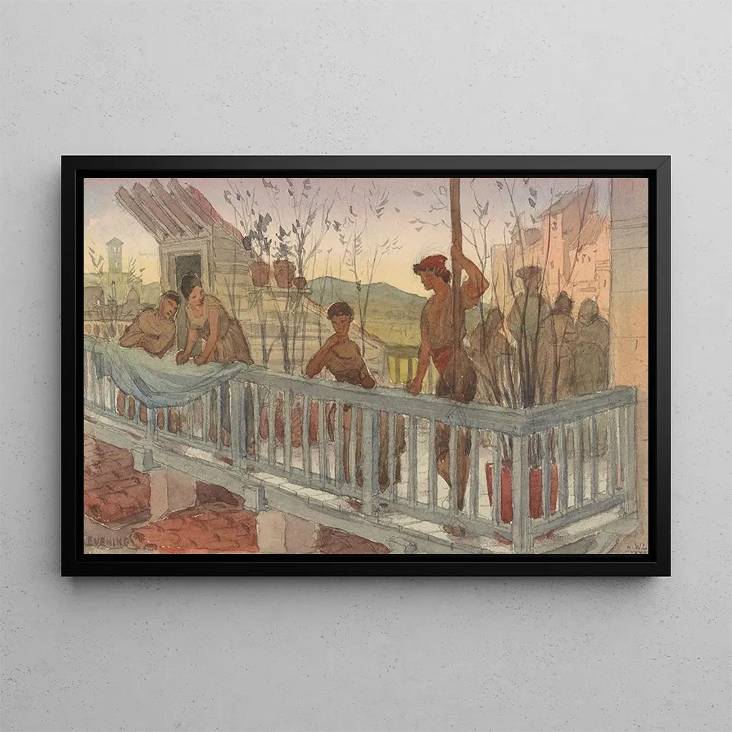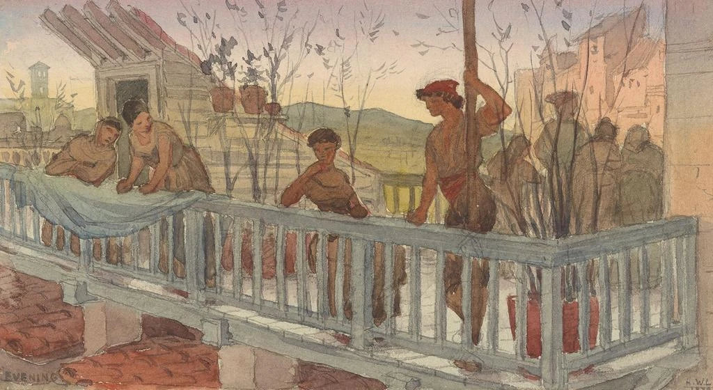 Horatio Walter Lonsdalen "Ilta"-taidegrafiikka kuvaa yöllistä kohtausta, jossa on pehmeyttä ja melankoliaa. Lämmintävät värit ja sinisen sävyt luovat rauhoittavan tunnelman, kun taas hahmojen siluetit piirtyvät hienovaraisesti himmeässä valossa. Lonsdalen tekniikka, joka yhdistää taitavasti realismia ja impressionismia, mahdollistaa hetken olemuksen vangitsemisen ajassa pysähtyneenä. Jokainen yksityiskohta, kuten veden heijastukset ja puiden varjot, lisää rauhallisuuden tunnelmaa ja kutsuu katsojan uppoutumaan tähän intiimiin kohtaukseen.