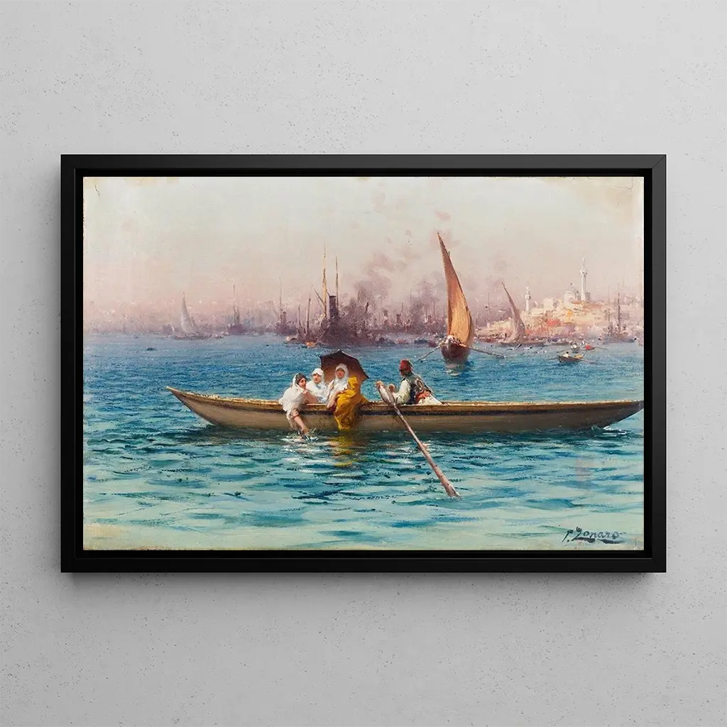 Tässä elävässä teoksessa Fausto Zonaro johdattaa meidät vilkkaalle merimaisemalle. Maalaus kuvaa iloisia hahmoja, jotka purjehtivat perinteisellä caïque-veneellä. Räikeät värit, syvänsinisestä merestä lämpimiin auringonlaskun sävyihin, luovat onnellisuuden ja vapauden tunnelman. Zonaron impressionistinen tekniikka, dynaamisilla siveltimenvedoillaan, herättää jokaisen yksityiskohdan eloon, tehden lähes kosketeltavaksi aaltojen liikkeen ja hahmojen naurun. Tämä taidegrafiikka Viihdytys caïquella kutsuu aistimatkalle, kuljettaen katsojan auringonpaisteisiin rantoihin.