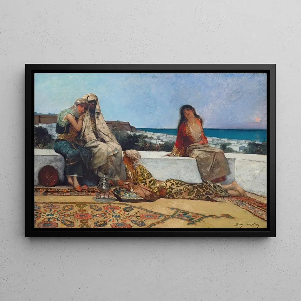 Jean-Joseph Benjamin-Constantin taidegrafiikka "Heures crépusculaires" on teos, joka herättää transition hetkien taian päivän ja yön välillä. lämpimät ja kultaiset värit sekoittuvat tummempiin sävyihin, luoden vaikuttavan kontrastin, joka vetää katseen puoleensa. öljymaalauksen tekniikka mahdollistaa valon vangitsemisen lähes kosketeltavalla tavalla, herättäen eloon hahmot ja niiden ympäristön. tämän taideteoksen tunnelma on sekä melankolinen että uneksiva, kutsuen katsojan uppoutumaan tähän katoavaan hetkeen, jossa aika tuntuu pysähtyneen.