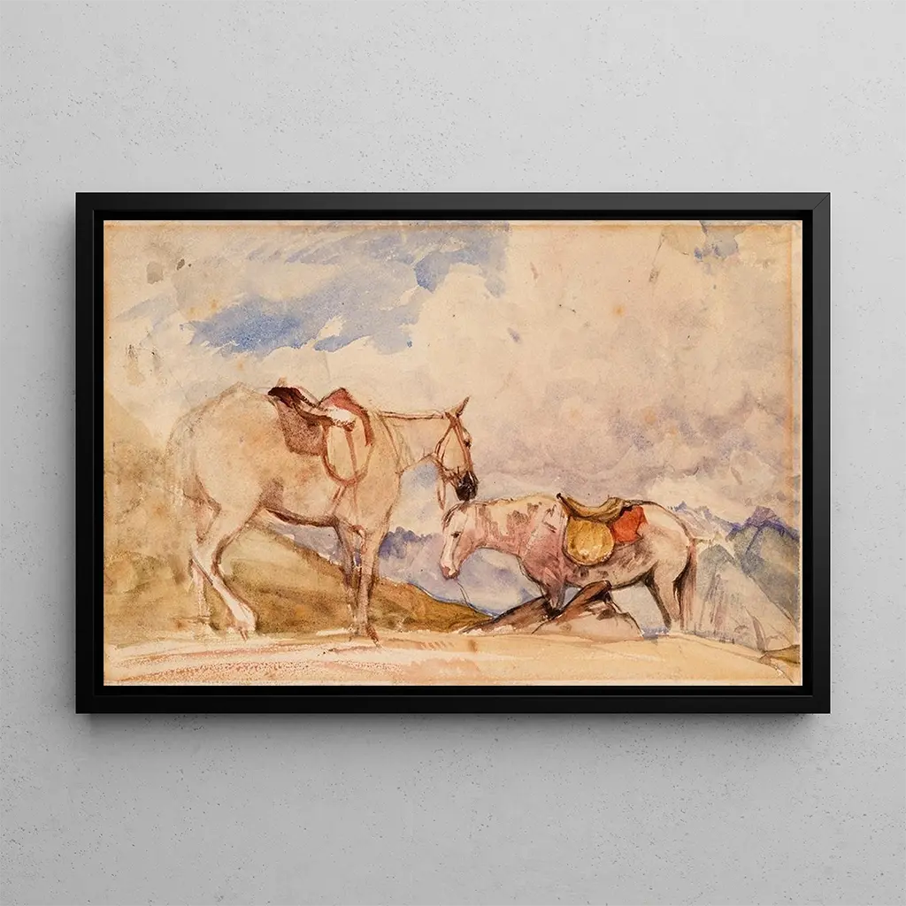 The taidegrafiikka Deux chevaux depicts a majestic scene where two horses stand proudly, symbols of strength and grace. The vibrant colors, ranging from warm browns to bright whites, create a striking contrast that immediately draws the eye. John Frederick Lewisin tekniikka, characterized by attention to detail and mastery of shadows, brings these animals to life, giving them an almost living presence. The atmosphere of the painting evokes harmony between nature and the creatures that inhabit it, inviting the viewer to appreciate the raw beauty of these animals.
