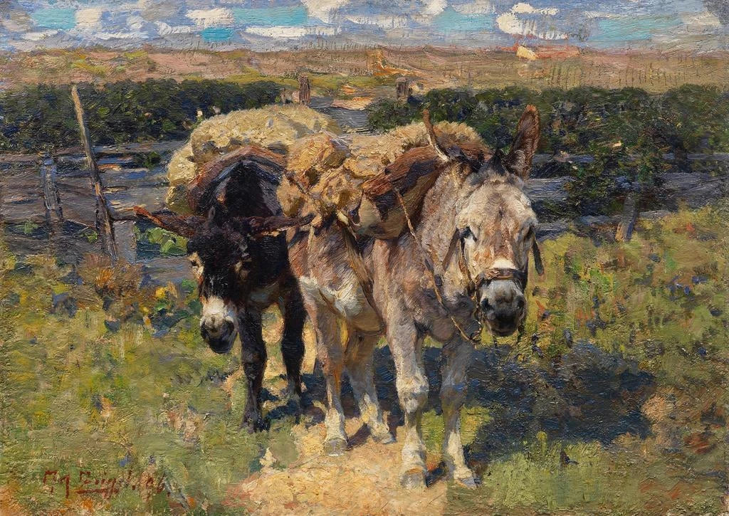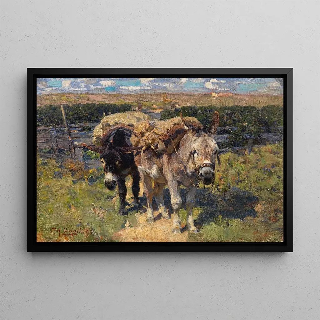 Heinrich von Zügel, syntynyt 1850, on tunnettu realistisista eläin- ja maisemakuvistaan. Hän kasvoi taiteellisessa perinteessä, joka arvostaa tarkkaa havainnointia, ja kehitti tyylin, joka yhdistää tarkkuuden ja herkkyyden. Zügelin vaikutteita sai naturalistinen liike, joka pyrki kuvaamaan luontoa uskollisesti. Hänen uransa, joka ulottuu 1800-luvun lopulle ja 1900-luvun alkuun, sisältää sarjan teoksia, jotka juhlistavat eläin- ja kasvilajiston kauneutta. "Deux ânes" on erinomainen esimerkki hänen kyvystään vangita yksinkertaisia mutta ilmeikkäitä elämän hetkiä.