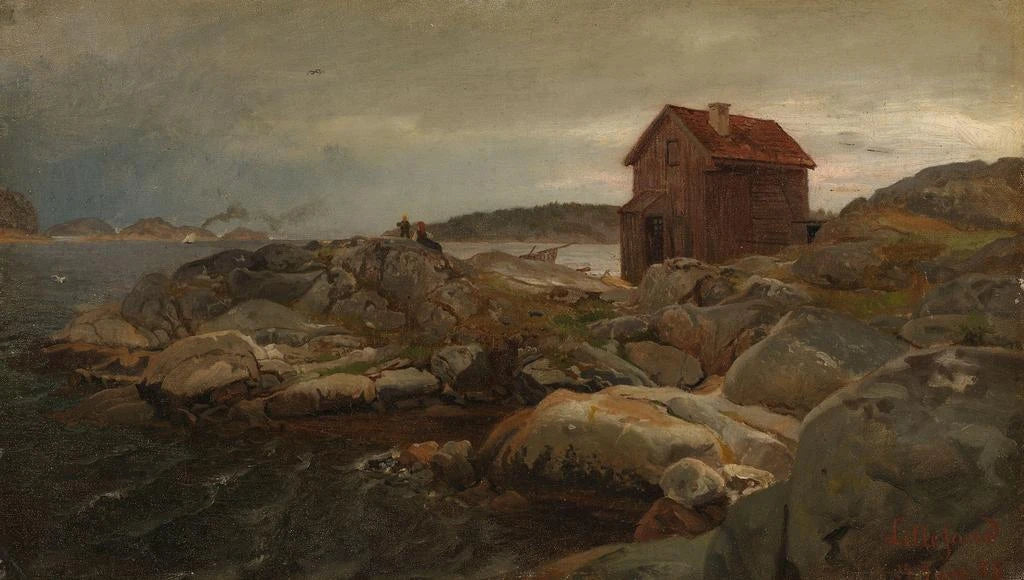 Hans Gude, peintre norvégien du XIXe siècle, est reconnu pour ses paysages marins et ses représentations de la nature scandinave. Influencé par le romantisme et le réalisme, il a su capturer la beauté des côtes norvégiennes et des scènes de la vie quotidienne. Gude a étudié à l'Académie des beaux-arts de Düsseldorf, où il a développé son style unique, alliant précision et sensibilité. Sa carrière a été marquée par une série d'expositions qui ont contribué à établir sa réputation en tant qu'artiste majeur de son époque. La Maison de pêcheur à Lillesand illustre parfaitement son talent pour représenter la lumière et l'atmosphère des paysages marins.