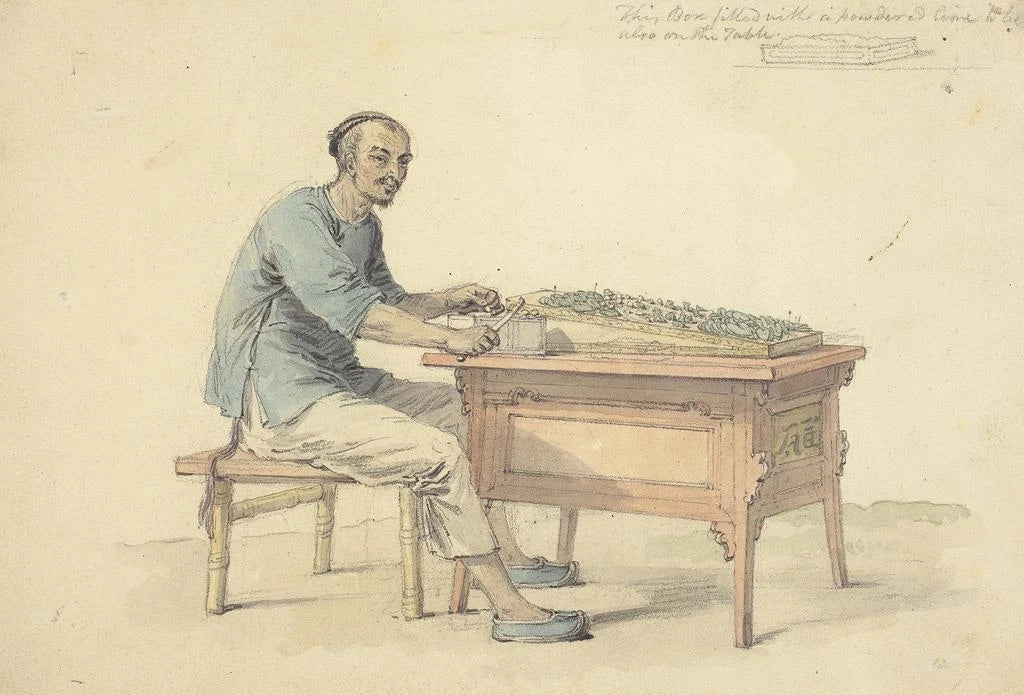 yhdysvaltalainen maalaus, joka esittää kiinalaista maanviljelijää myymässä betel-kasvia: aito elämänkohtaus