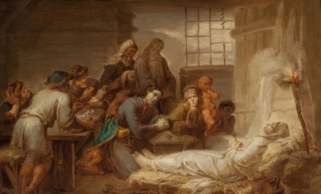 Dans "Mort en exil", Aleksander Kotsis dépeint une scène tragique et émotive, où la figure centrale semble perdue dans ses pensées, entourée d'un paysage désolé. Les teintes sombres et les ombres accentuent le sentiment de mélancolie qui émane de cette œuvre. La technique de Kotsis, alliant réalisme et expressionnisme, permet de ressentir la profondeur de l'angoisse humaine face à l'isolement. Chaque détail, du visage du personnage aux éléments du décor, contribue à créer une atmosphère chargée d'émotion, invitant le spectateur à réfléchir sur la condition humaine.