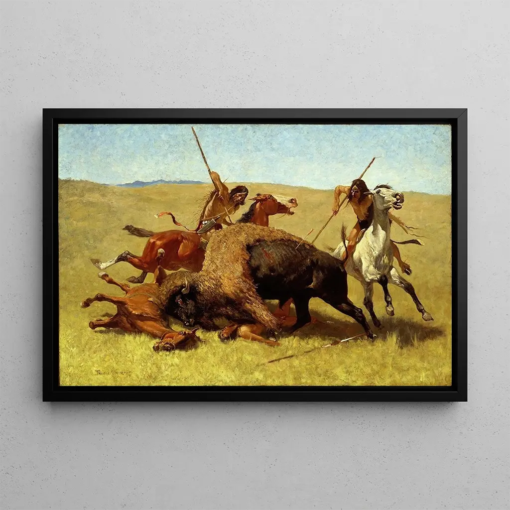Frederic Remington, actif à la fin du XIXe siècle, est célèbre pour ses représentations de la vie dans l'Ouest américain. Influencé par ses voyages et ses rencontres avec les peuples autochtones, il a su capturer la culture, la faune et la flore de cette région. Son style, alliant réalisme et romantisme, a façonné l'image que l'on a aujourd'hui de l'Ouest sauvage. "La chasse au bison" est l'une de ses œuvres emblématiques, illustrant son engagement à immortaliser les scènes de la vie frontalière et à rendre hommage à la majesté de la nature.