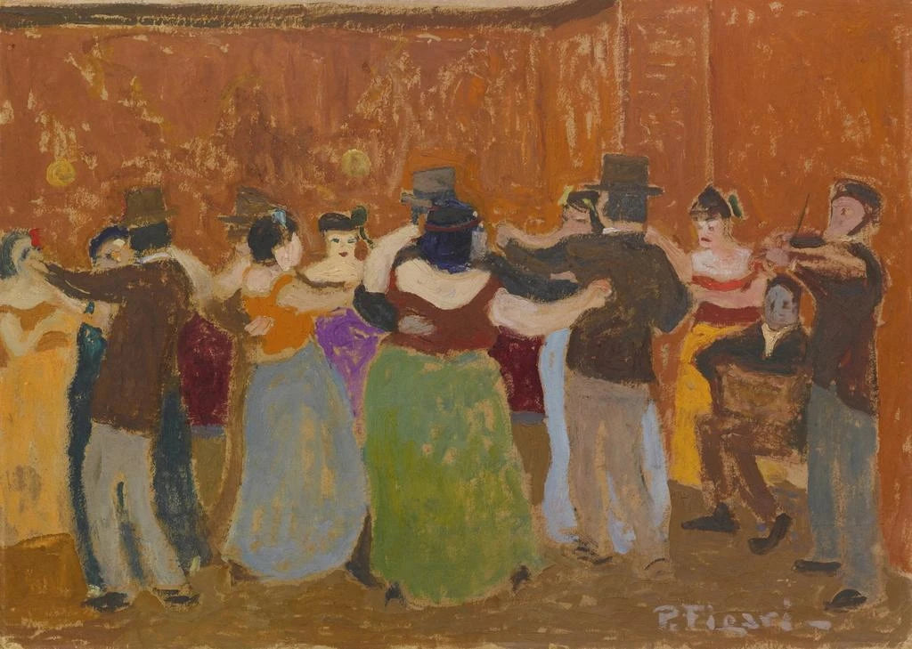 Dans "Le Cabaret Tango", Pedro Figari nous plonge dans l'univers vibrant et passionné du tango argentin. Les personnages, habillés de costumes flamboyants, semblent prendre vie sous le pinceau de l'artiste, tandis que les couleurs chaudes et les formes dynamiques évoquent la musique et le mouvement. Figari, avec sa technique de peinture à l'huile, réussit à capturer l'énergie et la sensualité de cette danse emblématique, créant une atmosphère festive et envoûtante qui transporte le spectateur au cœur de la culture argentine.