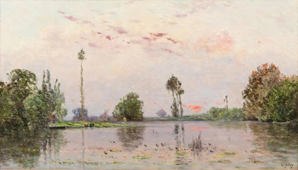 Hippolyte Camille Delpy, actif au XIXe siècle, est reconnu pour sa capacité à capturer la lumière et l'atmosphère dans ses paysages. Influencé par l'impressionnisme, il a su développer un style unique qui se distingue par sa palette vibrante et ses coups de pinceau dynamiques. Delpy a été exposé aux œuvres de ses contemporains, tels que Monet et Pissarro, ce qui a façonné son approche artistique. Son travail, bien que moins connu que celui de certains de ses pairs, a contribué à l'évolution de la peinture paysagère en France. "L'Étang au crépuscule" témoigne de son talent à immortaliser des moments fugaces de la nature.