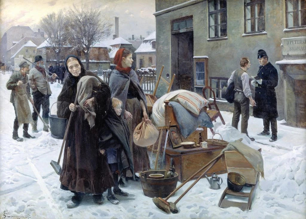 Dans "Locataires expulsés", Erik Henningsen capture l'essence d'un moment tragique avec une intensité émotionnelle saisissante. La composition, centrée sur des figures humaines en détresse, est dominée par des teintes sombres qui évoquent la mélancolie et l'angoisse. Les détails minutieux des visages et des postures transmettent une atmosphère de désespoir, tandis que la lumière, subtilement utilisée, souligne les expressions des personnages. Cette œuvre, à la fois réaliste et dramatique, nous plonge dans une réalité sociale difficile, invitant à la réflexion sur la condition humaine.