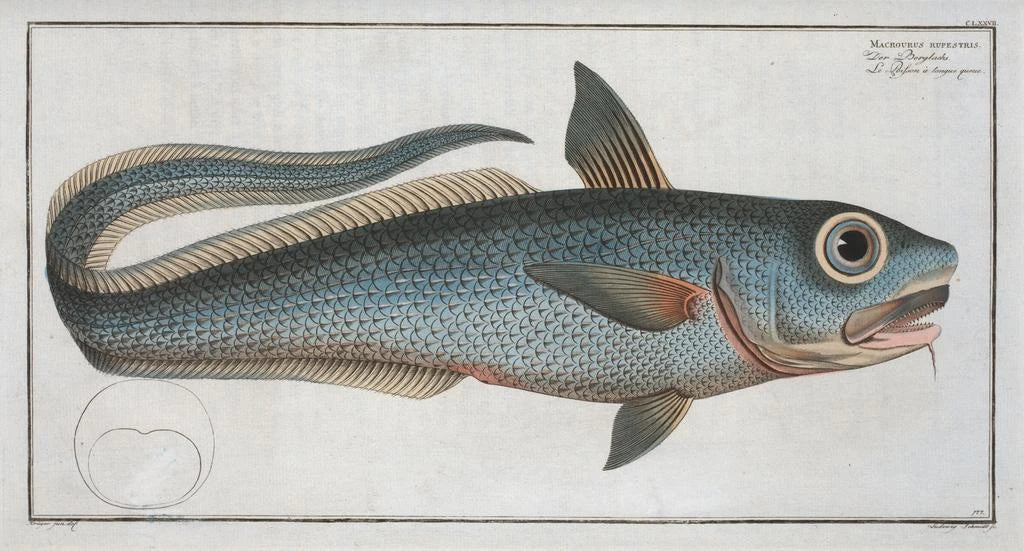 The taidegrafiikka Macrourus rupestris, jonka on tehnyt Marcus Elieser Bloch, vie meidät kiehtovaan vesimaailmaan. Tämä taideteos korostaa tämän syvänmeren kalan yksityiskohtia, väreiltään syvästä sinisestä hopeanharmaaseen, viitaten veden alla suodattuvaan valoon. Akvatint-kiinnitystekniikka mahdollistaa kalan ihon tekstuurin lähes tuntuvan tavalla, luoden salaperäisen ja kiehtovan ilmapiirin. Teos kutsuu tarkkaavaiseen pohdintaan, paljastaen merenelävien piilotetun kauneuden.