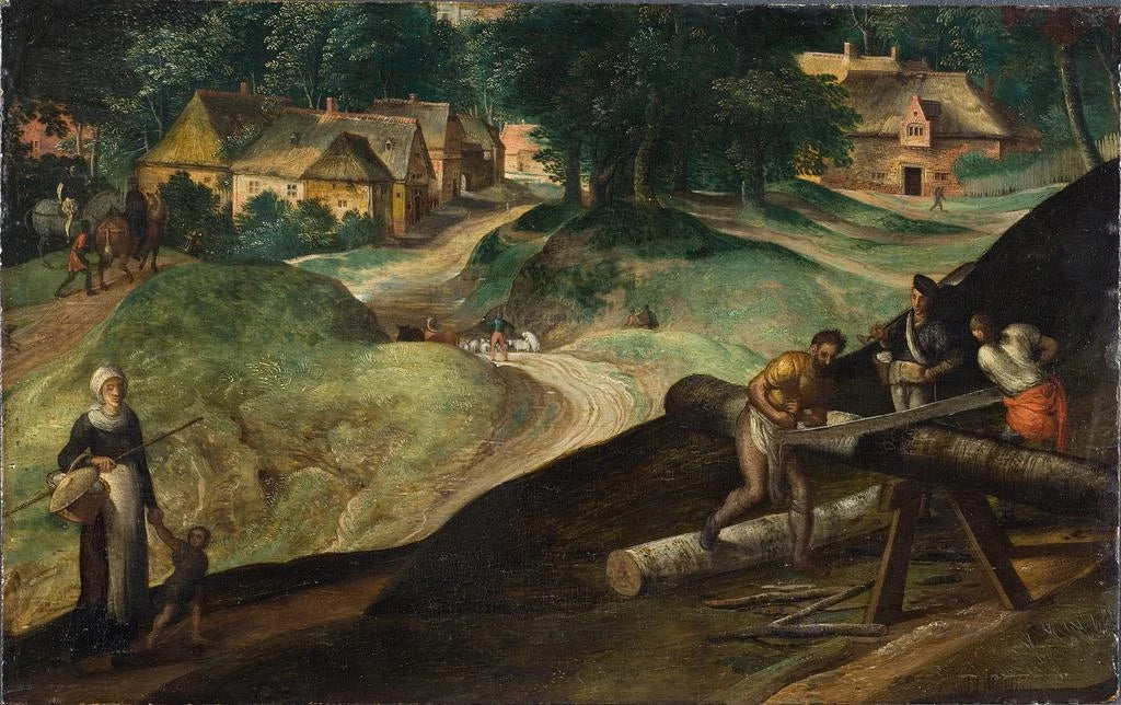 Maisemakuva miehistä sahaamassa puuta - Gillis Mostaert