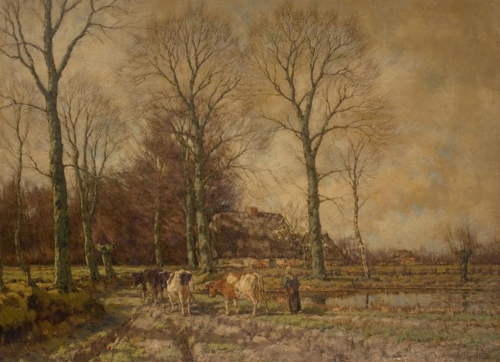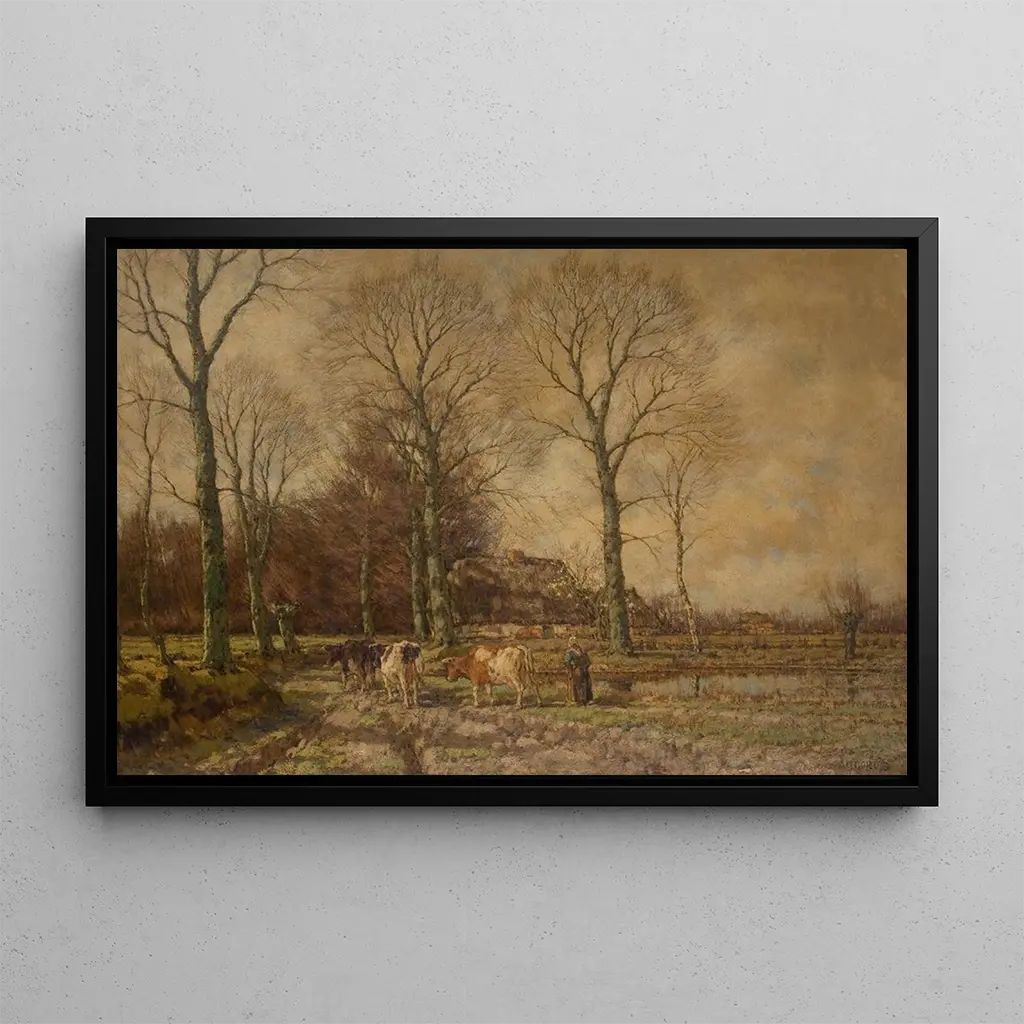Arnold Marc Gorter, peintre néerlandais du XIXe siècle, est reconnu pour sa capacité à capturer la beauté des paysages de son pays. Influencé par le mouvement réaliste, il s'inscrit dans une tradition artistique qui valorise la représentation fidèle de la nature. Gorter a également été marqué par l'école de La Haye, qui prônait l'observation directe des scènes de la vie quotidienne. Ses œuvres, souvent empreintes de lumière et de couleur, témoignent d'un profond respect pour l'environnement rural et la vie des agriculteurs. Ce tableau, comme beaucoup d'autres, illustre son engagement à immortaliser la beauté des paysages néerlandais.