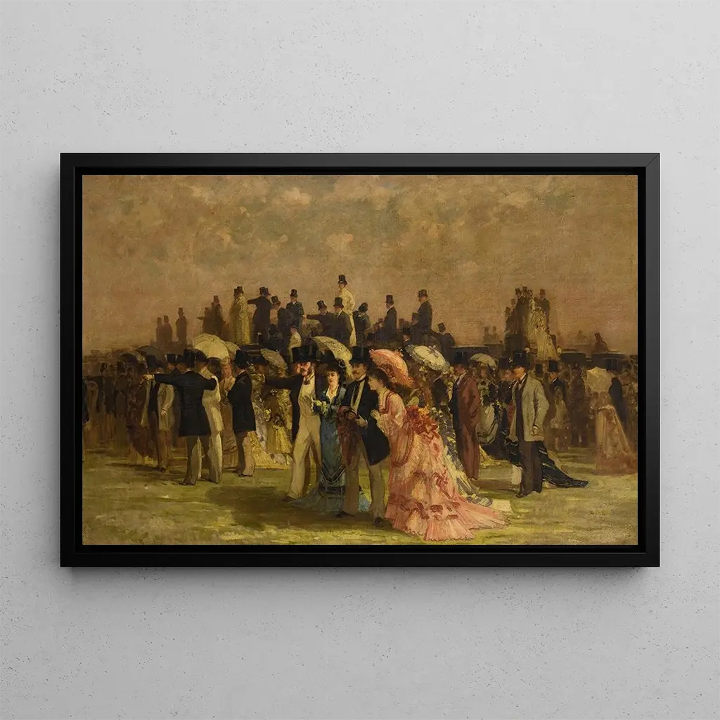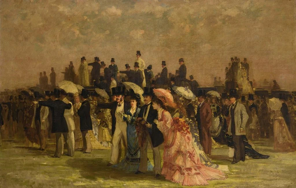 Tässä elävässä teoksessa Louis Abel-Truchet vangitsee kilpailupäivän jännityksen, jossa elegantit naiset liikkuvat sulavasti. Säihkyvät värit ja hienostuneet yksityiskohdat mekkojen kuvauksessa luovat ylellisen ja hienostuneen tunnelman. Taiteilijan tekniikka, yhdistäen impressionismin ja realismin, herättää jokaisen hahmon eloon, kun taas taustan epätarkkuus viittaa liikkeeseen ja tapahtuman jännitykseen. Naisten kasvot, vaikka tyyliteltyjä, välittävät syvää tunnetta, kutsuen katsojan uppoutumaan tähän vilkkaaseen kohtaukseen.