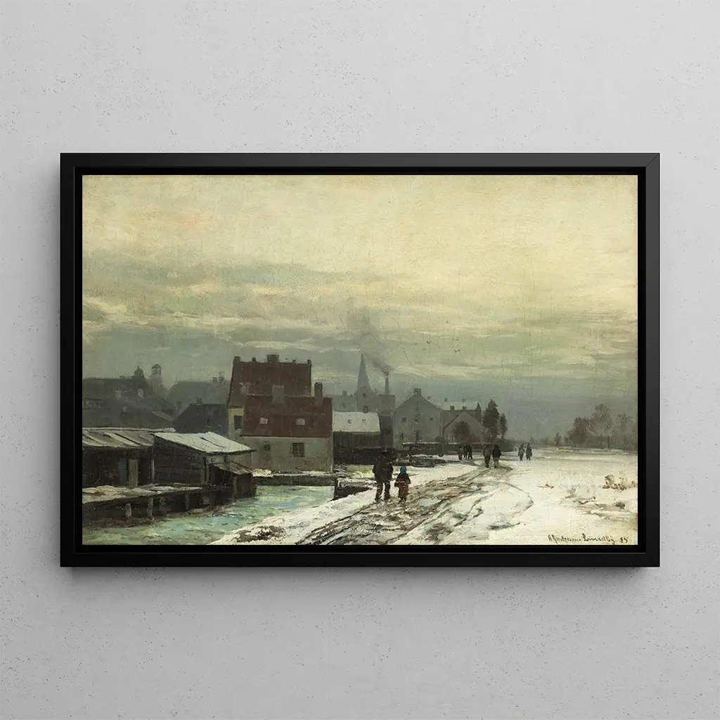Dans "Paysage d'hiver", Anders Andersen-Lundby nous transporte au cœur d'une scène hivernale empreinte de magie. La toile, baignée de lumière douce, met en avant un paysage enneigé où les flocons scintillent sous un ciel clair. Les arbres, recouverts d'une fine couche de neige, se dressent avec grâce, tandis qu'un ruisseau, partiellement gelé, serpente à travers la composition. La technique de Lundby, alliant réalisme et impressionnisme, crée une atmosphère paisible et contemplative, invitant le spectateur à s'évader dans cet univers hivernal enchanteur.