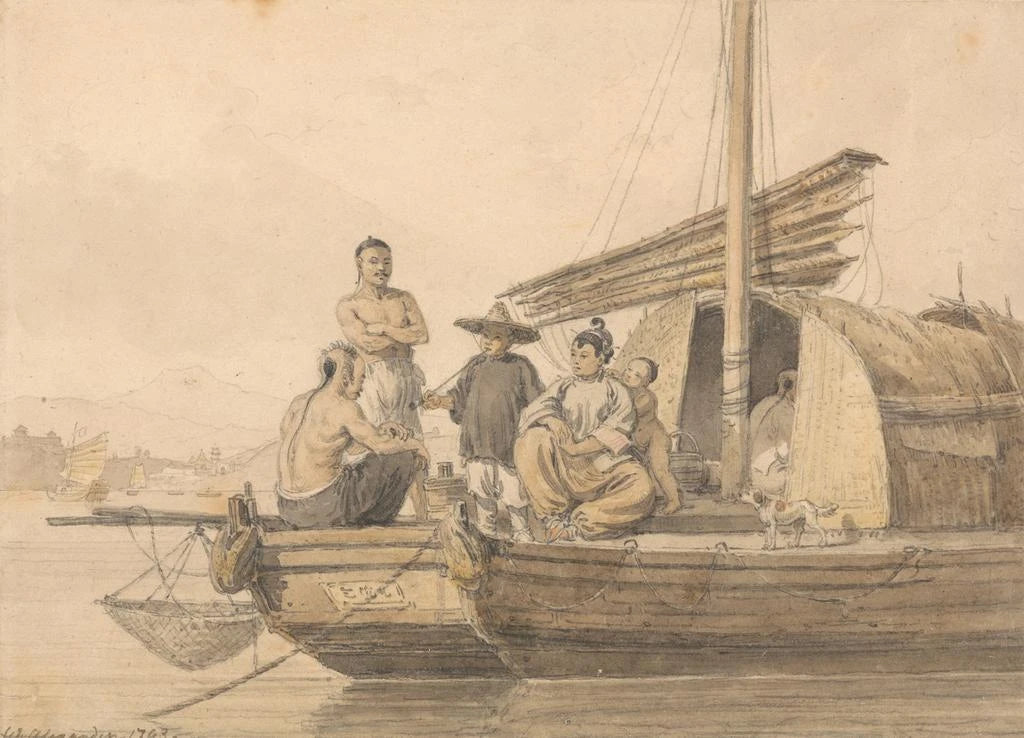 La reproduction Pêcheurs sur une Jonque de William Alexander nous plonge dans l'ambiance sereine d'une journée sur l'eau. Les couleurs éclatantes du ciel se mêlent aux reflets chatoyants de l'eau, créant une atmosphère paisible et contemplative. La technique de l'aquarelle, maîtrisée par l'artiste, permet de capturer la lumière et le mouvement des vagues, tandis que les silhouettes des pêcheurs, concentrés sur leur tâche, ajoutent une dimension humaine à cette scène maritime. Chaque détail, des voiles blanches aux nuances de bleu, évoque une harmonie entre l'homme et la nature, invitant le spectateur à s'évader vers des rivages lointains.