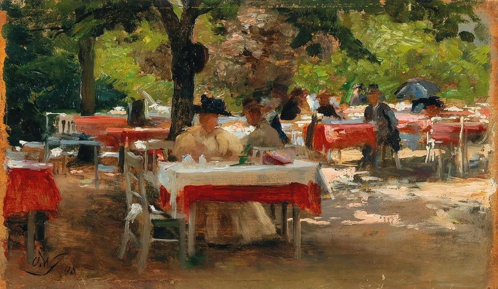 Dans cette œuvre, Olga Wisinger-Florian nous plonge dans une atmosphère intimiste où la lumière douce caresse les visages des convives. Les couleurs pastel, délicates et chaleureuses, évoquent un moment de partage autour d'un petit déjeuner. Les détails minutieux des objets de la table, tels que la porcelaine et les fruits, ajoutent une touche de réalisme à cette scène paisible. La composition harmonieuse, centrée sur les personnages, invite le spectateur à s'immiscer dans ce moment de vie, où le temps semble suspendu, et où la convivialité règne en maître.