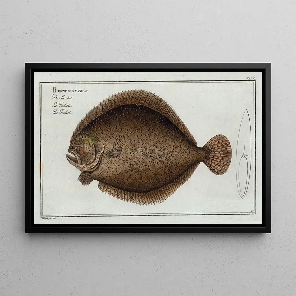 {{reproduction}} Pleuronectes maximus, le turbot, jonka on tehnyt Marcus Elieser Bloch, tarjoaa yksityiskohtaisen ja kiehtovan esityksen tästä tasapohjaisesta kalasta. Sen sävyjen, kuten ruskean ja beigen, vivahteet sekä hienovaraiset kuviot sen ihossa, on esitetty poikkeuksellisen tarkasti. Bloch, luonnontutkijana ja kuvittajana, onnistuu vangitsemaan paitsi turbotin ulkonäön myös sen olemuksen. Tämä teos, sekä tieteellinen että taiteellinen, johdattaa meidät merenalaisen maailman syvyyksiin, paljastaen merenelämän kauneuden ja monimutkaisuuden.