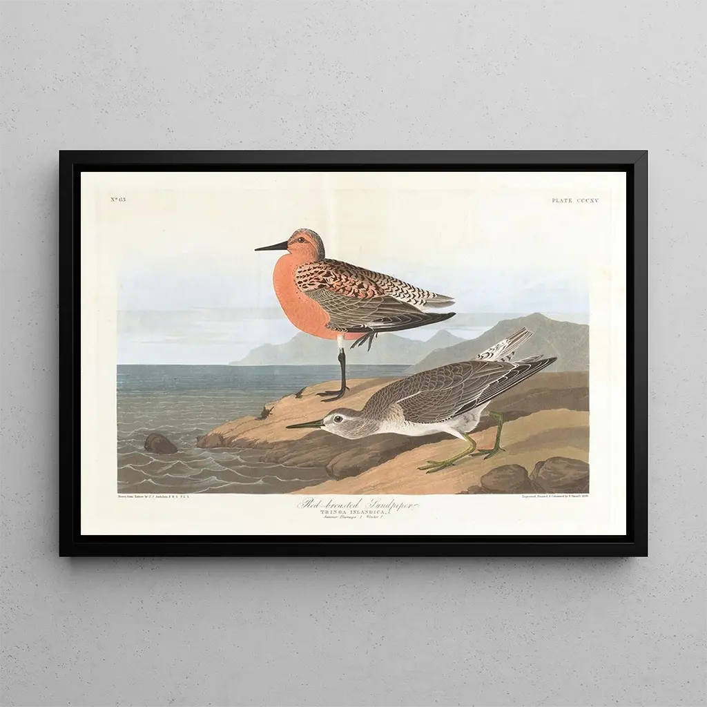 John James Audubon, naturaliste et artiste du début du XIXe siècle, est reconnu pour ses contributions à l'étude des oiseaux en Amérique. Son approche novatrice, alliant art et science, a permis de documenter de nombreuses espèces avec une précision inégalée. Audubon a voyagé à travers le continent, observant et peignant des oiseaux dans leur environnement naturel. Son œuvre, dont "Bécasseau à poitrine rousse" est un exemple emblématique, a non seulement enrichi le monde de l'art, mais a également sensibilisé le public à la biodiversité et à la conservation des espèces.