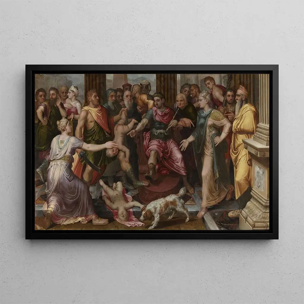 Le Jugement de Salomon : une scène de sagesse et de justice La taidegrafiikka du Jugement de Salomon nous plonge dans une scène emblématique de sagesse et de discernement. Frans Floris, avec sa maîtrise des couleurs et des formes, met en lumière le moment crucial où le roi Salomon, entouré de courtisans, doit trancher dans un conflit entre deux femmes. Les expressions des personnages, allant de l'angoisse à l'espoir, sont magnifiquement capturées, créant une atmosphère dramatique et captivante. La richesse des détails et la profondeur des ombres ajoutent une dimension presque théâtrale à cette œuvre, invitant le spectateur à réfléchir sur la nature de la justice. Frans Floris : un maître de la renaissance flamande Frans Floris, peintre flamand du XVIe siècle, est reconnu pour son style qui allie la rigueur de la renaissance à une sensibilité baroque naissante. Formé dans l'atelier de Pieter Aertsen, il développe une approche narrative dans ses œuvres, souvent inspirées de thèmes bibliques et mythologiques. Son travail se distingue par une attention minutieuse aux détails et une utilisation audacieuse de la couleur, faisant de lui un acteur majeur de l'art flamand. Le Jugement de Salomon est l'une de ses œuvres les plus célèbres, illustrant son talent pour représenter des scènes complexes avec une grande expressivité. Une acquisition décorative aux multiples atouts La taidegrafiikka du Jugement de Salomon est un choix décoratif qui apportera une touche de sophistication à votre intérieur. Que ce soit dans un salon, un bureau ou une bibliothèque, cette toile attire l'œil et suscite la réflexion. Sa qualité d'impression assure une fidélité remarquable aux nuances et aux détails de l'œuvre originale, tout en offrant une esthétique riche et captivante. En intégrant ce tableau dans votre décoration, vous créez un espace inspirant, où l'art et la sagesse se rencontrent pour enrichir votre quotidien.