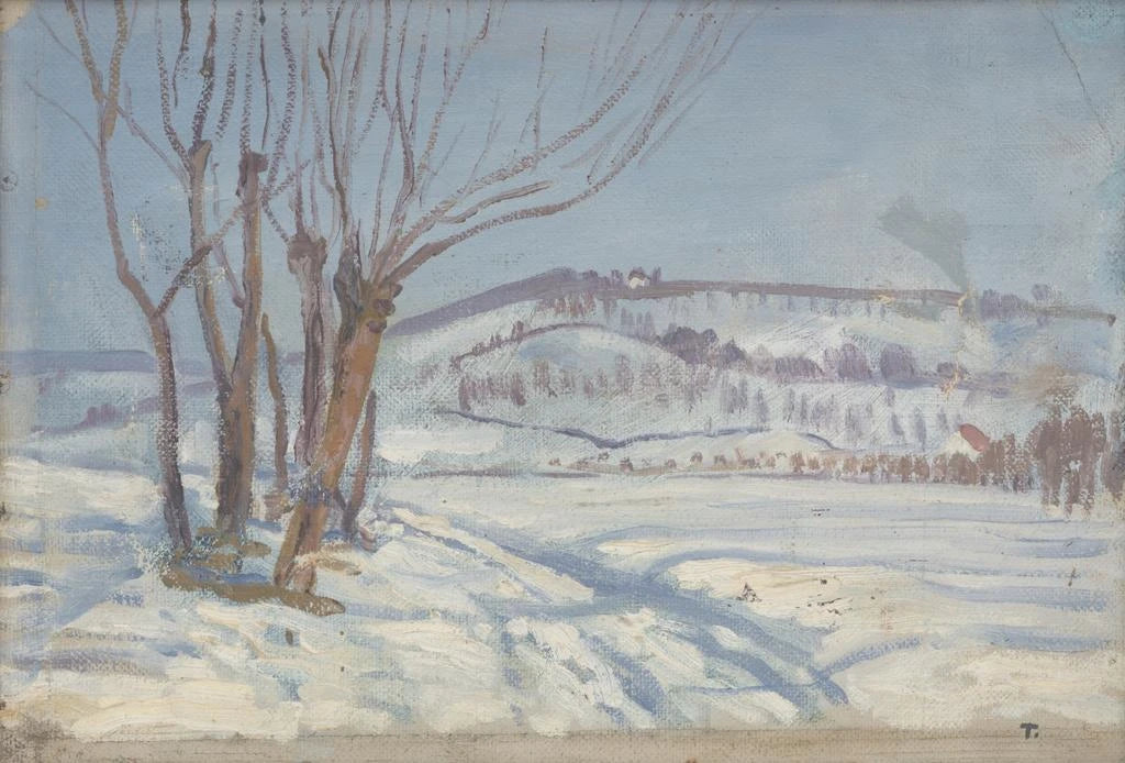 John Thainin maalaus "Talvinen maisema" kuvaa rauhallisen ja lumoavan kohtauksen, jossa lumi peittää herkästi maiseman. Pehmeät valkoisen ja sinisen sävyt sekoittuvat luoden hiljaisen ja rauhallisen tunnelman, joka kutsuu pohdintaan. Öljyväritekniikka kankaalle mahdollistaa Thainin vangitsevan talvisen valon, herättäen eloon jokaisen lumihiutaleen ja varjon. Tämä maalaus herättää hiljaisen talven kauneuden, hetken, joka pysyy hetkessä, kun luonto näyttää lepäävän valkoisen peittonsa alla.