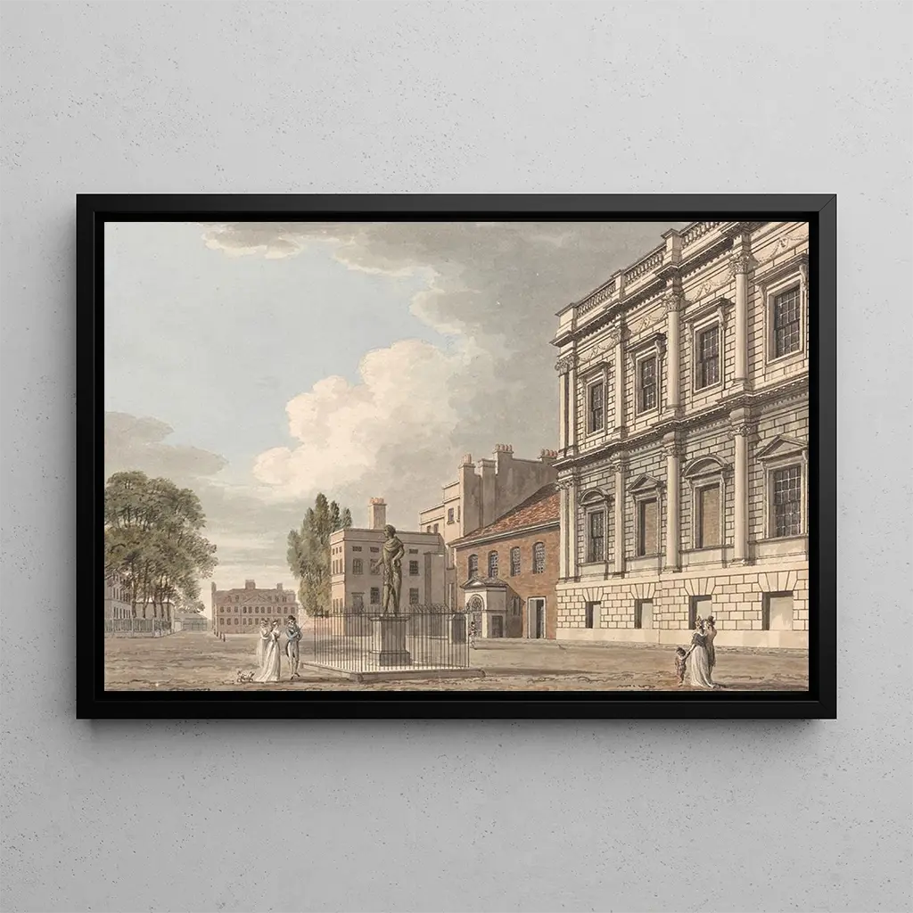 Tämä taidegrafiikka Banqueting House, Whitehall, vie meidät 1600-luvun arkkitehtuurin ytimeen. Tämä ikoninen teos, jonka on luonut Thomas Malton le Jeune, erottuu majesteettisilla linjoillaan ja hienostuneella valon käytöllään. Pehmeät värit ja yksityiskohtaiset pienet elementit luovat juhlavan ja samalla lämpimän ilmapiirin. Taidegrafiikka viittaa aikaan, jolloin taide ja arkkitehtuuri yhdistyivät juhlistamaan Britannian kuningashuoneen suuruutta. Jokainen sivellinvedos tuntuu kertovan tarinan, kutsuen katsojan tutkimaan tämän historiallisesti merkittävän rakennuksen hienouksia.