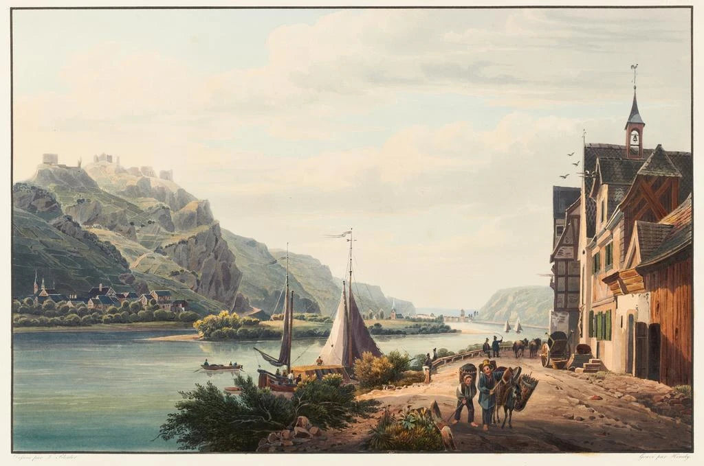 "Vue d'Hammerstein vers Andernach" on kiehtova taidegrafiikka, joka tarjoaa panoraamanäkymän Rhin-joen rannoille. Johann Ludwig Bleuler, pehmeiden värien paletillaan ja hienovaraisilla siveltimenvedoillaan, onnistuu välittämään tämän maiseman luonnollisen kauneuden. Vihreät kukkuloiset mäet kohoavat majesteettisesti, kun taas joki kiemurtelee rauhallisesti, heijastaen auringonvaloa. Tämä rauhan ja harmonian tunnelma, joka huokuu tästä taideteoksesta, kutsuu katsojan mietiskelyyn ja pakoon, kuljettaen hänet luonnon sydämeen.