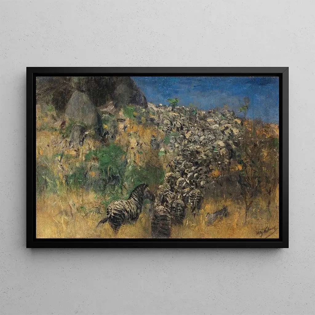Troupeau de zèbres en fuite : une danse sauvage dans la savane Dans cette taidegrafiikka de l'œuvre "Troupeau de zèbres en fuite", Wilhelm Kuhnert capture l'essence même de la vie sauvage. Les zèbres, en pleine course, sont représentés avec une dynamique saisissante, leurs rayures noires et blanches créant un contraste frappant avec le paysage doré de la savane. La technique de l'artiste, qui mêle réalisme et impressionnisme, donne une atmosphère vibrante à la scène, invitant le spectateur à ressentir l'urgence et la liberté de ces animaux majestueux. Les nuances de couleurs, allant des bruns chauds aux verts doux, ajoutent à la profondeur de l'œuvre, faisant de cette toile un véritable appel à l'évasion. Wilhelm Kuhnert : un maître de la faune sauvage Wilhelm Kuhnert, né en 1865, est un peintre allemand reconnu pour ses œuvres dédiées à la faune. Influencé par ses voyages en Afrique, il a su retranscrire avec précision la beauté des animaux dans leur habitat naturel. Son style, ancré dans le réalisme, se distingue par une attention minutieuse aux détails et une compréhension profonde des comportements animaliers. Kuhnert a été un pionnier dans la représentation de la vie sauvage, et son travail a eu un impact significatif sur l'art animalier au début du XXe siècle. Ses œuvres continuent d'inspirer les artistes contemporains et les amateurs d'art, témoignant de l'importance de son héritage. Une acquisition décorative aux multiples atouts La taidegrafiikka du "Troupeau de zèbres en fuite" est une pièce décorative qui s'intègre parfaitement dans divers espaces, que ce soit un salon, un bureau ou une chambre. Sa qualité d'impression garantit une fidélité aux couleurs et aux détails de l'œuvre originale, offrant ainsi un attrait esthétique indéniable. En choisissant ce tableau, vous ajoutez une touche d'élégance et de nature à votre intérieur, tout en suscitant des conversations autour de la beauté de la faune. Cette toile est non seulement un élément décoratif, mais aussi une invitation à explorer la majesté du monde animal.
