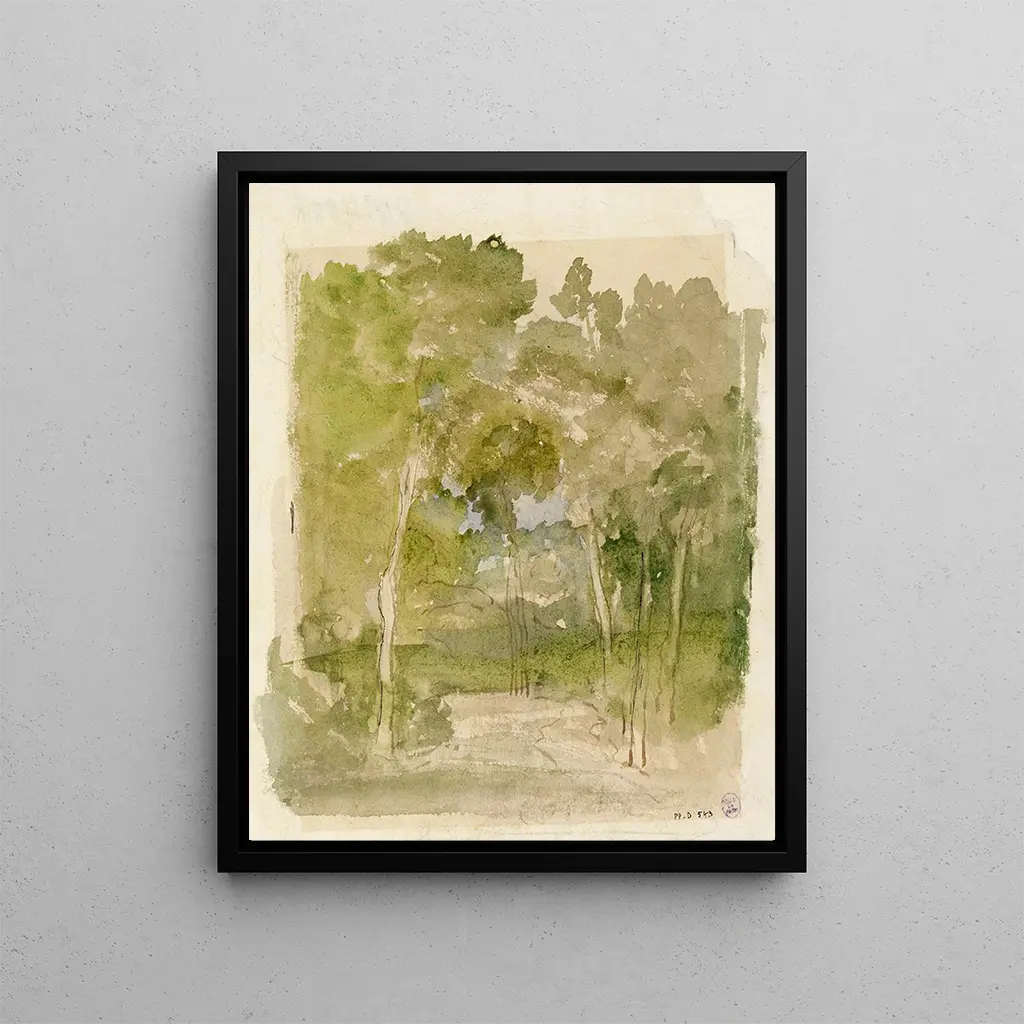 Narcisse Virgile Diaz de la Peña:n taidegrafiikka, joka kuljettaa katsojan vehreän metsän sydämeen. Vihreän sävyt sulautuvat harmonisesti kultaisiin valonpilkahduksiin, luoden rauhallisen ja salaperäisen tunnelman. Taiteilijan herkkä sivellintekniikka herättää jokaisen lehden ja oksan eloon, kutsuen syvälliseen pohdintaan. Varjot tanssivat valon kanssa, viitaten maailmaan, jossa luonto hallitsee, ja jossa katse hukkuu luonnon villiin kauneuteen.