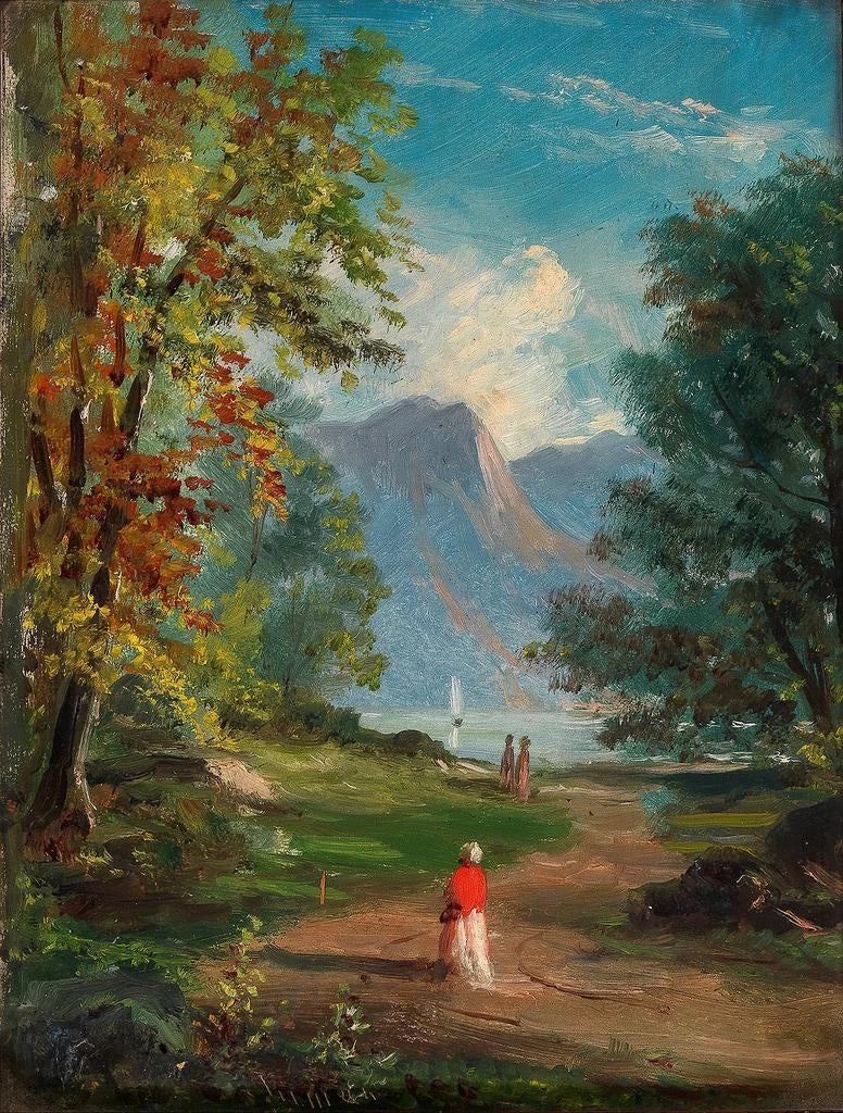 Maisons en pierre dans un paysage de campagne, avec un arbre et un chemin, dans un style réaliste. Signé en bas à droite. Cadre en bois doré. Dimensions : 40 x 50 cm.