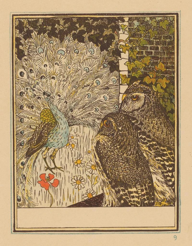 Näyttää peacockin ja kaksi pöllöä - Theo van Hoytema