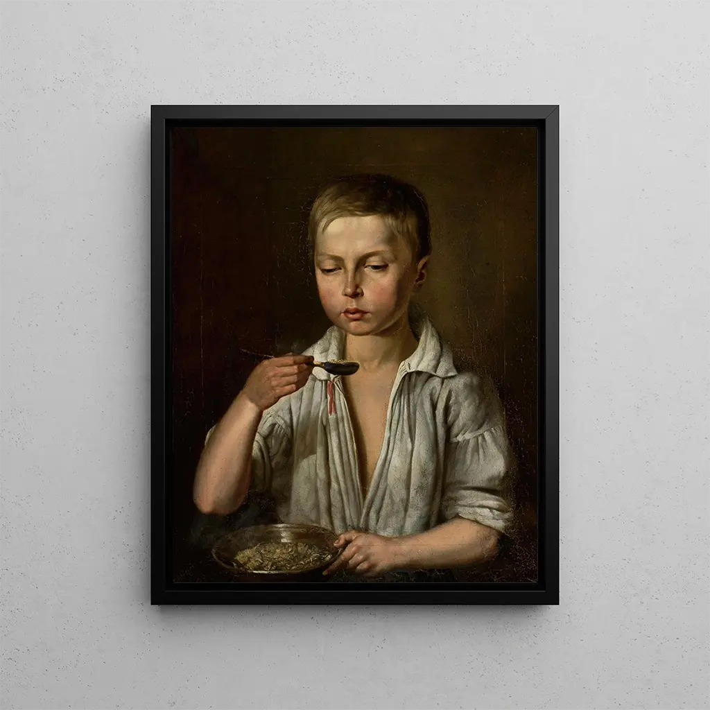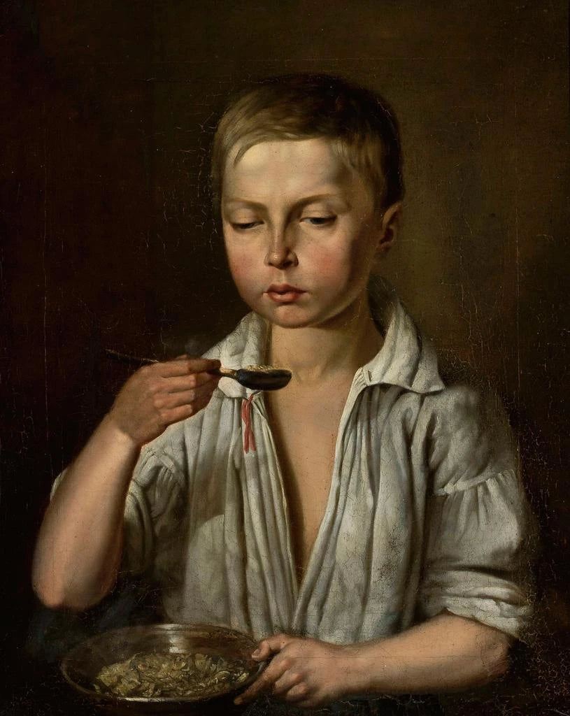 Aikuinen poimii aamiaista lapselta, joka istuu pöydän ääressä. Tämä taideteos on mestarillinen esitys arkisesta hetkestä, joka heijastaa rauhallista ja lämpimää tunnelmaa.