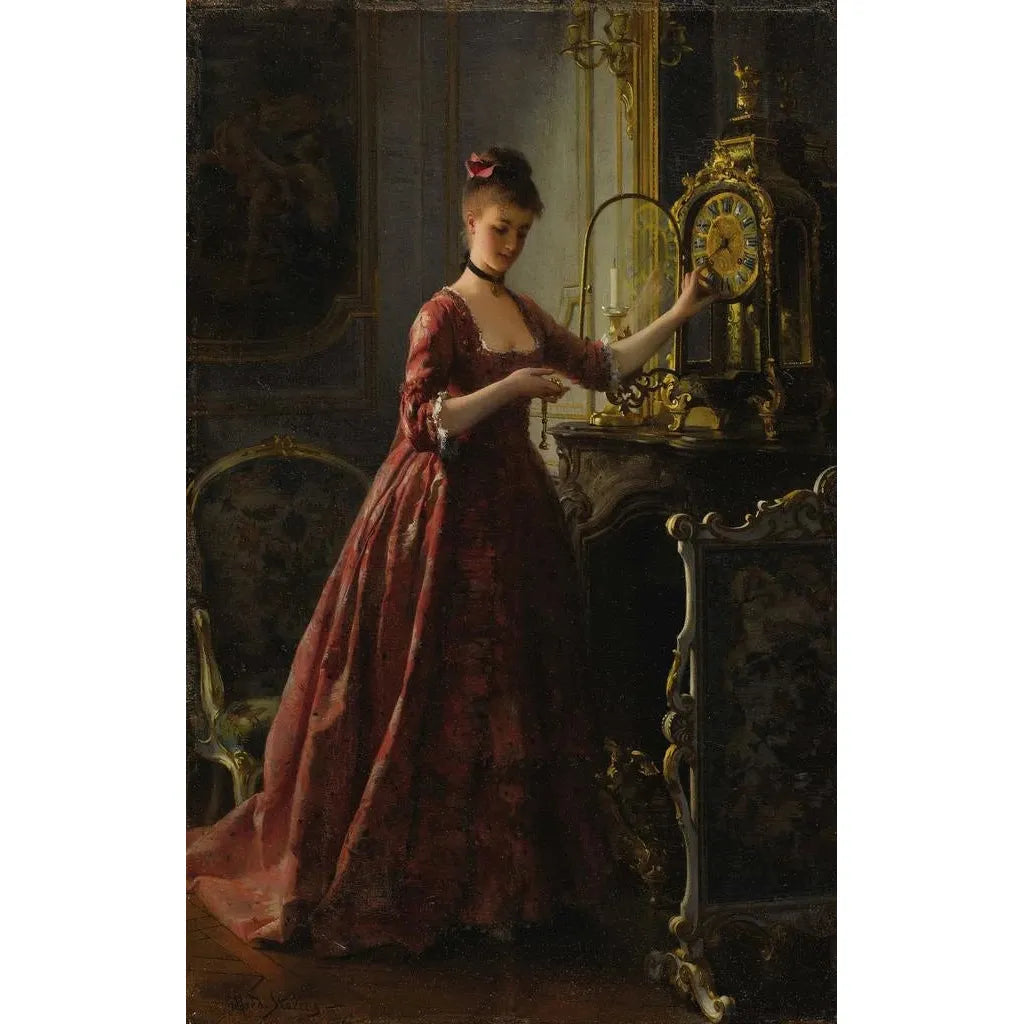 Remontant l'horloge de cheminée d'Alfred Stevens capture un moment intime et nostalgique, où le temps semble suspendu. La scène, riche en détails, met en avant une femme absorbée par la tâche de remonter une horloge, symbole du passage du temps. Les couleurs chaudes et les jeux de lumière créent une atmosphère chaleureuse et accueillante, tandis que la technique de Stevens, alliant réalisme et finesse, donne vie à chaque élément de la composition. Ce tableau évoque une mélancolie douce, rappelant l'importance des souvenirs et des instants partagés.