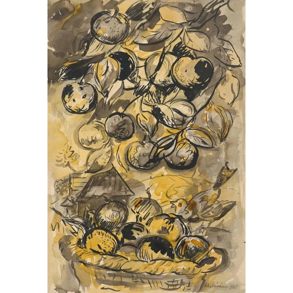 La taidegrafiikka "Nature morte avec des pommes" d'Arnold Peter Weisz-Kubínčan est une œuvre qui célèbre la beauté des objets du quotidien. Dans cette composition, les pommes, d'un rouge éclatant, sont mises en valeur sur une table, entourées de nuances de vert et de terre. La technique de l'artiste, qui mêle réalisme et touches impressionnistes, crée une atmosphère vivante et chaleureuse. Les jeux de lumière et d'ombre confèrent une profondeur à la scène, rendant les fruits presque tangibles. Cette nature morte invite à une contemplation attentive, révélant la poésie cachée dans la simplicité des objets.