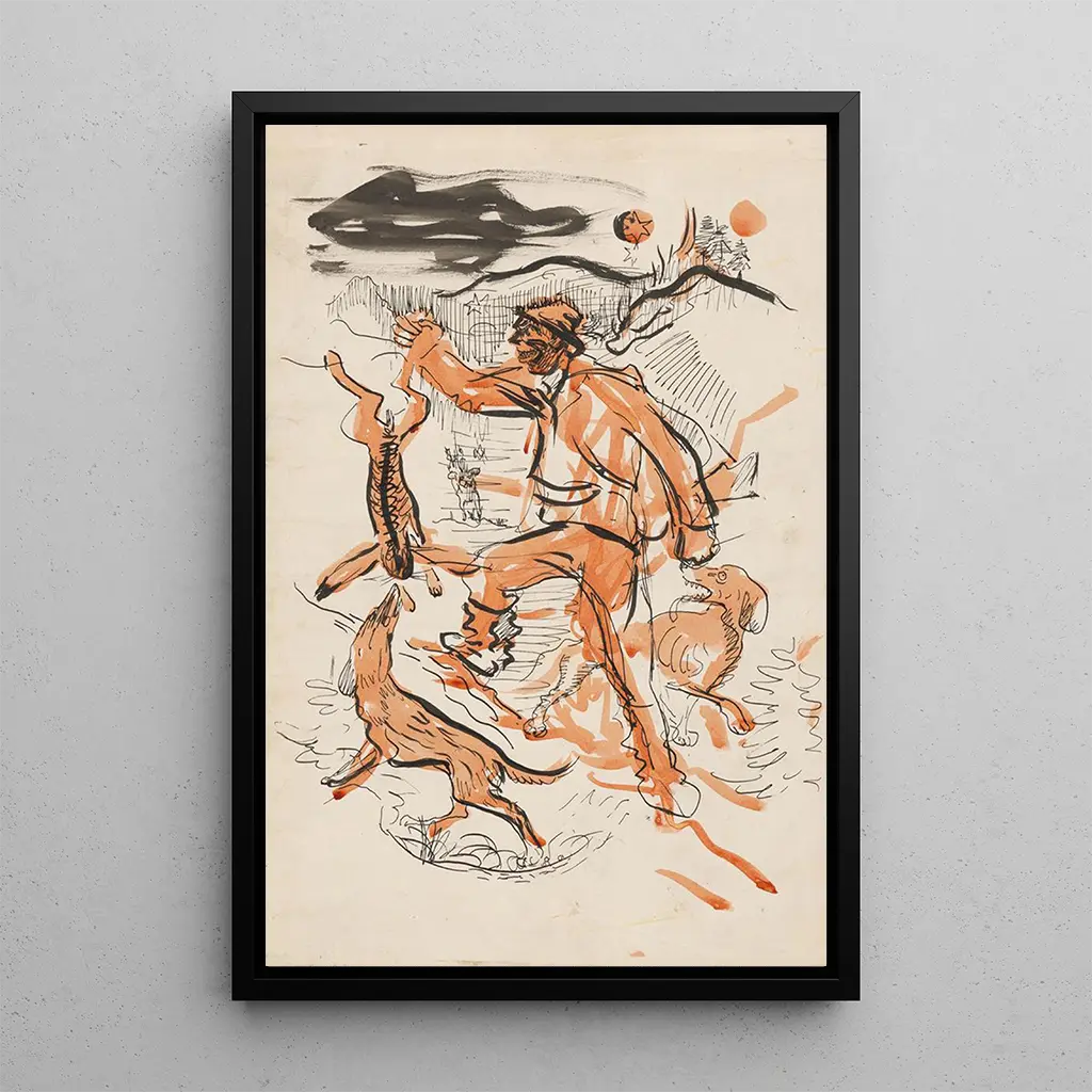 Arnold Peter Weisz-Kubínčan'in "Chasse nocturne" taidegrafiikka herättää salaperäisen tunnelman, jossa metsästäjien siluetit sulautuvat yöhön. Tummat sävyt hallitsevat, korostettuina hienovaraisilla valon välähdyksillä, jotka valaisevat yksityiskohtaisesti hahmoja ja ympäröivää eläimistöä. Taiteilijan tekniikka, joka yhdistää realismia ja impressionismia, luo kiehtovan dynamiikan, kutsuen katsojan syventymään tähän yölliseen kohtaukseen. Jokainen sivellinvedos tuntuu kertovan tarinan, jossa luonto ja ihminen elävät harmoniassa, mutta häiritsevästi rinnakkain.