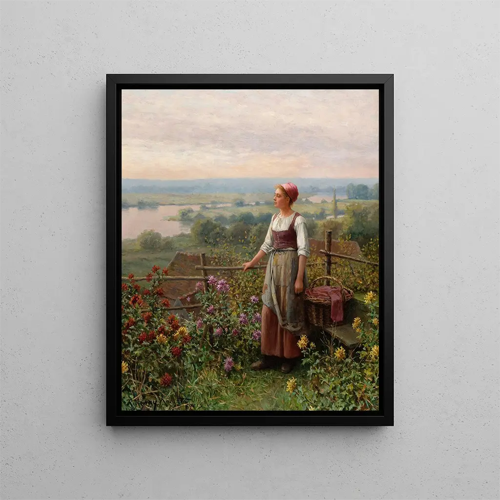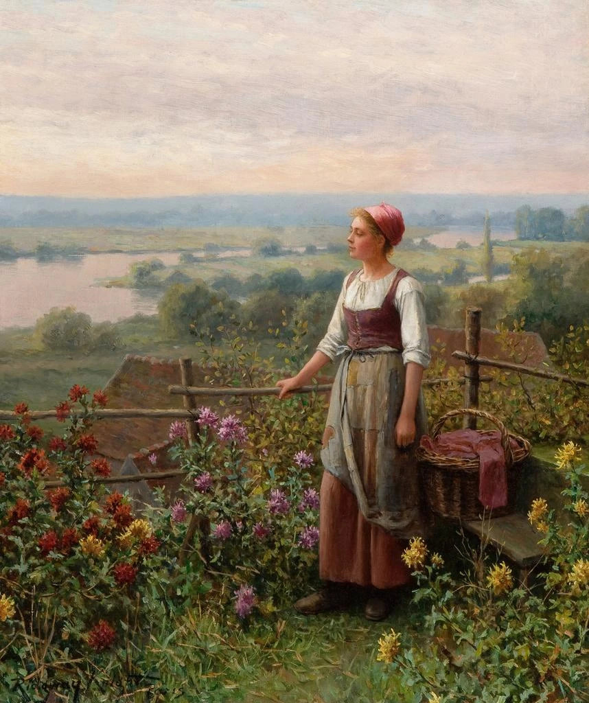 Daniel Ridgway Knight, syntynyt vuonna 1839, on yhdysvaltalainen maalari, jonka taiteellinen ura on syvästi vaikuttanut Euroopan, erityisesti Ranskan, vierailu. Impressionistien mestareilta vaikutteita saanut, hän on kehittänyt oman tyylinsä, joka yhdistää realismia ja runoutta. Knight omisti suuren osan urastaan maalaamaan maaseudun kohtauksia ja rentoutumishetkiä ulkona, heijastaen näin yksinkertaisen ja harmonisen elämän ihannetta. Hänen teoksensa, rikas väreissä ja tunteissa, on onnistunut viehättämään laajaa yleisöä, tehden hänestä yhden aikansa arvostetuimmista taiteilijoista. "Soirée