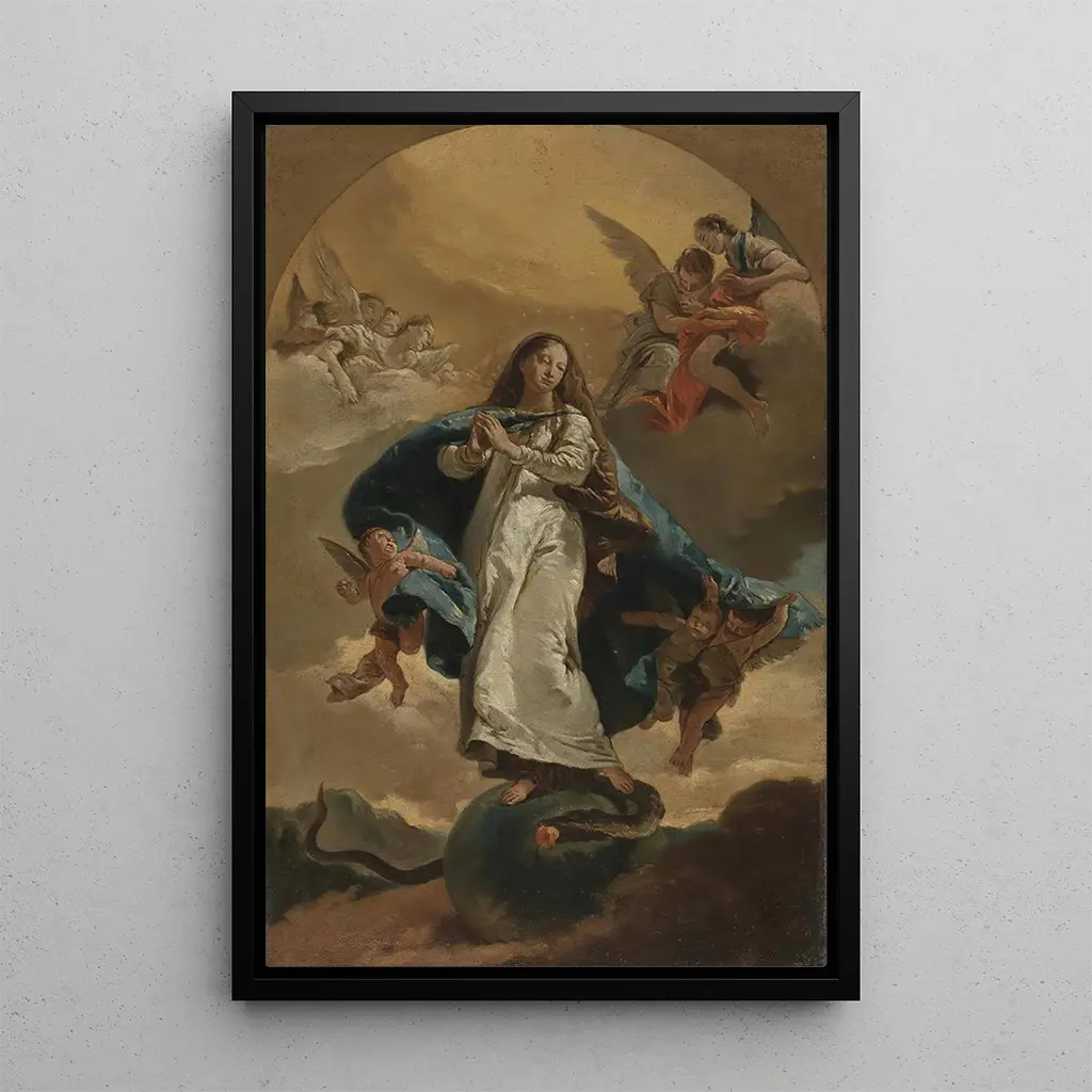 “L'Immaculée Conception” Giovanni Battista Tiepolo on ikoninen taidegrafiikka, joka kuvaa Marian neitsyyden puhtautta ja armon. Taulussa on hienovarainen väripaletti, jossa pastellivärit sulautuvat harmonisesti luoden eteerisen tunnelman. Tiepolo käyttää valon ja varjon leikkiä korostaakseen keskeisiä figuureja ja niiden henkistä merkitystä. Dynaaminen sommittelu ja hienostuneet yksityiskohdat osoittavat taiteilijan kyvyn vangita syviä tunteita, tehden tästä taidegrafiikasta kiehtovan ja inspiroivan.