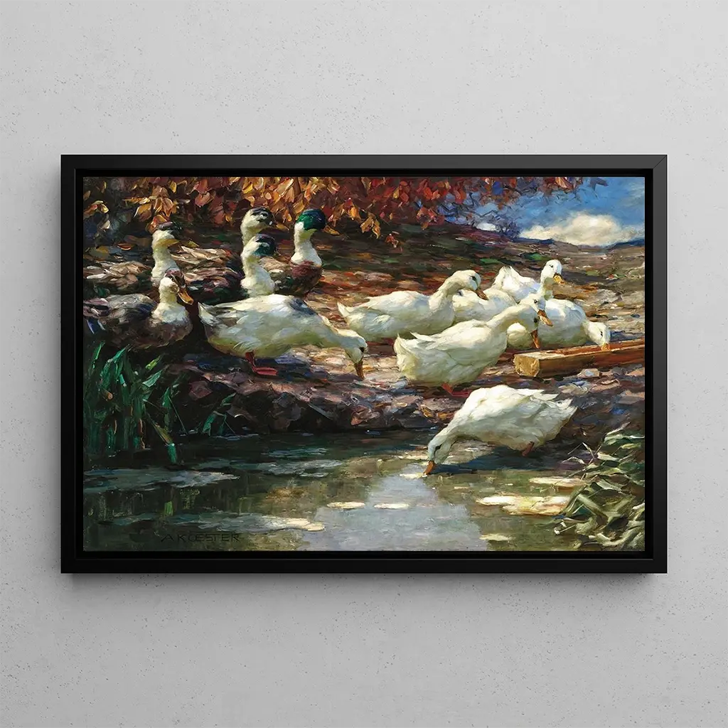 Douze kania lähteellä: maalaisidyllinen kohtaus täynnä elämää Kohteessa "Douze kania lähteellä" taiteilija vangitsee hetken rauhaa veden äärellä. Kanit, erilaisilla höyhenpeitteillään, liikkuvat sulavasti, kun taas valo leikkii lähteen heijastuksissa. Värikkäät sävyt ja yksityiskohtaiset pienet elementit luovat iloisen ja dynaamisen tunnelman, kutsuen katsojan uppoutumaan tähän rauhalliseen kohtaukseen. Käytetty tekniikka, todennäköisesti akvarelli tai öljymaalaus, tuo keveyttä ja sujuvuutta, jotka tekevät teoksesta elävän. Jokainen kani vaikuttaa kertovan tarinan, lisäten runollisuutta tähän koostelmaan. Twelve Ducks at the Fountain: luonnollisen liikkeen heijastus Twelve Ducks at the Fountain on ikoninen teos taiteilijalta, jonka tyyli kuuluu 1800-luvun naturalistiseen suuntaukseen. Tämä taidesuuntaus, joka korostaa luonnon uskollista esittämistä, ammentaa inspiraationsa suoraan eläin- ja kasvikunnan havainnoista. Taiteilija, vaikutteita saanut mestareilta kuten Jean-Baptiste-Siméon Chardin, on onnistunut vangitsemaan yksinkertaisen kauneuden arkipäivästä. Hänen kykynsä kunnioittaa luontoa samalla sisällyttäen realismia tekee hänestä merkittävän hahmon aikakaudellaan, edistäen eläinmaalauksen kehitystä. Monipuolinen koristeellinen taidegrafiikka "Douze canard à la fontaine" -taidegrafiikan reproduktio on erinomainen valinta sisustuksen kaunistamiseen, olipa kyseessä olohuone, toimisto tai makuuhuone. Sen tulostuslaatu ja uskollisuus alkuperäisväreille takaavat esteettisen viehätyksen. Tämä taidegrafiikka tuo raikkautta ja luonnon tuntua sisustukseesi, samalla herättäen keskustelua taiteesta ja luonnonvaraisuudesta. Sisällyttämällä tämän teoksen tilaan luot lämpimän ja kutsuvan ilmapiirin, juhlistaen samalla vesieläinlajin kauneutta.