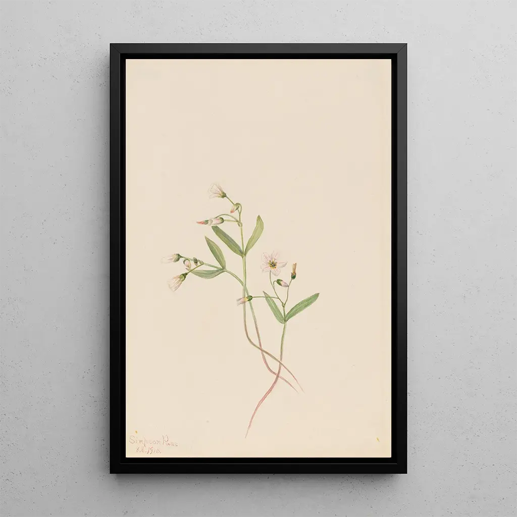 Claytonie de printemps Claytonia lanceolata -taidegrafiikka herättää keväisen hetken, jossa pastellisävyjen pehmeys kietoutuu lehtien raikkauden kanssa. Vaaleanvihreän ja vaaleanpunaisen sävyt sulautuvat harmonisesti luoden rauhoittavan ja virkistävän tunnelman. Mary Vaux Walcottin käyttämä vesiväritekniikka vangitsee kukkavartaloiden keveyden ja läpinäkyvyyden, herättäen tämän herkkäkasvuisen kasvin eloon. Jokainen yksityiskohta, lehtien suonista varjoihin, kutsuu tarkkaavaiseen ja luonnollisen kauneuden kunnioittavaan tarkasteluun.