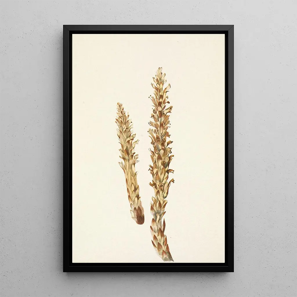 Conopholis d'Amérique, eli Conopholis americana, paljastaa kiehtovan kasvin, joka on usein tuntematon, mutta erottuu ainutlaatuisen ulkonäkönsä ansiosta. Tämän teoksen kultaiset ja ruskeat sävyt, jotka on toteutettu huomattavalla huolellisuudella, muistuttavat metsän pohjakerroksen sävyjä. Mary Vaux Walcott, vesiväritekniikkansa avulla, onnistuu vangitsemaan paitsi tämän kasvin epätavallisen muodon, myös sen luonnollisen elinympäristön salaperäisen tunnelman. Jokainen sivellinvedos tuntuu kertovan tarinan, tarinan lajista, joka kukoistaa suurten puiden varjossa.