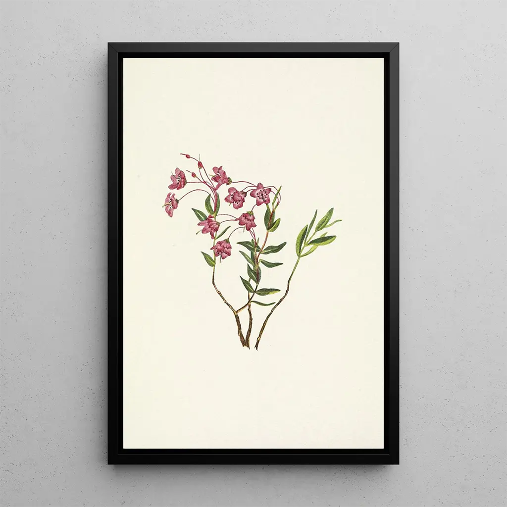La taidegrafiikka Kalmia des montagnes Rocheuses, jonka on luonut Mary Vaux Walcott, johdattaa meidät upean kukkivan maailman äärelle. Tämä teos korostaa Kalmia microphylla -kukan herkkää kauneutta, sävyiltään vaaleanpunaisesta syvään violettiin. Vesiväritekniikka, jota taiteilija käyttää, antaa teokselle keveyttä, kun taas yksityiskohtaiset terälehtien ja lehtien yksityiskohdat vangitsevat tämän ikonisen vuoristokasvin olemuksen. Tämän maalauksen tunnelma muistuttaa luonnossa kävelyä, jossa jokainen kukka tuntuu värähtelevän tuulen tahdissa.